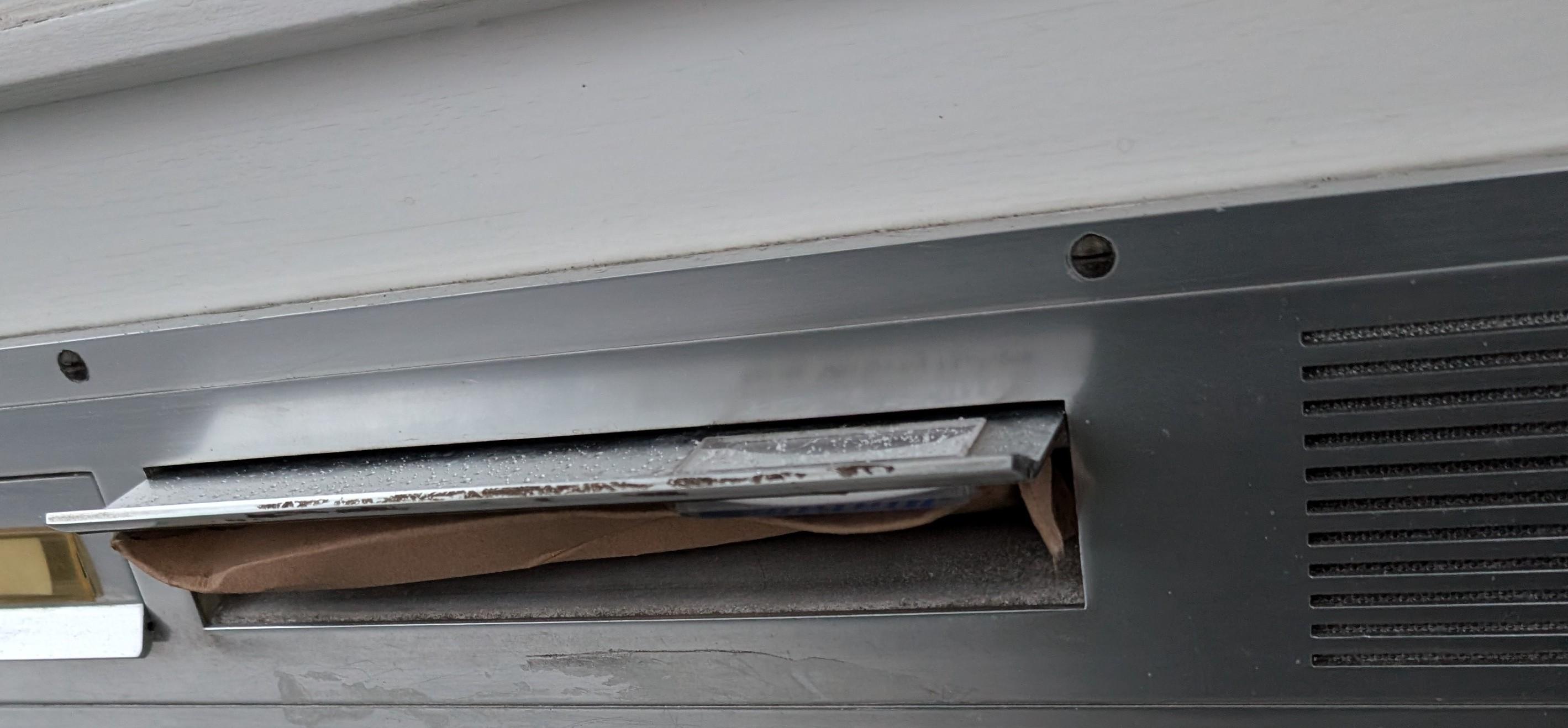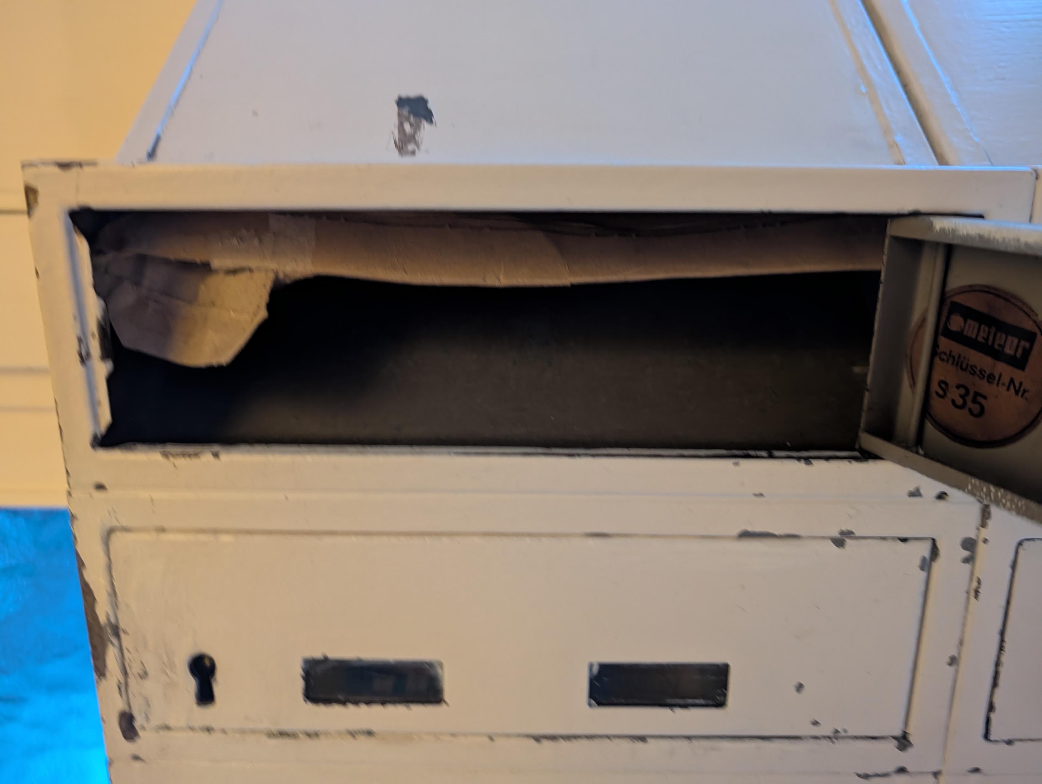 alt Die Innenseite des Briefkastens. Die Verpackung ist komplett eingeklemmt. Die Innenseite des Briefkastens. Die Verpackung ist komplett eingeklemmt.
