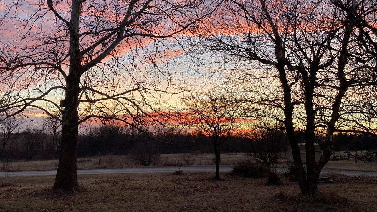 alt A multi-colored sky just before sunrise — seen through the dark, leafless branches of trees in the yard. A multi-colored sky just before sunrise — seen through the dark, leafless branches of trees in the yard.