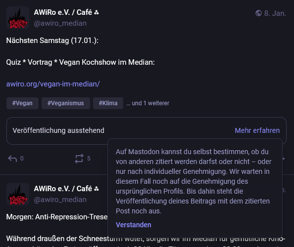 Versffentlichung ausstehend - Auf Mastodon kannst du selbst bestimmen, ob du von anderen zitiert werden darfst oder nicht - oder nur nach individueller Genehmigung. Wir warten in diesem Fall noch auf die Genehmigung des AWiRoeV./ Café & spriinglichen Profils. Bis dahin steht die @awiro_median Veroffentlichung deines Beitrags mit dem zitierten noch aus.