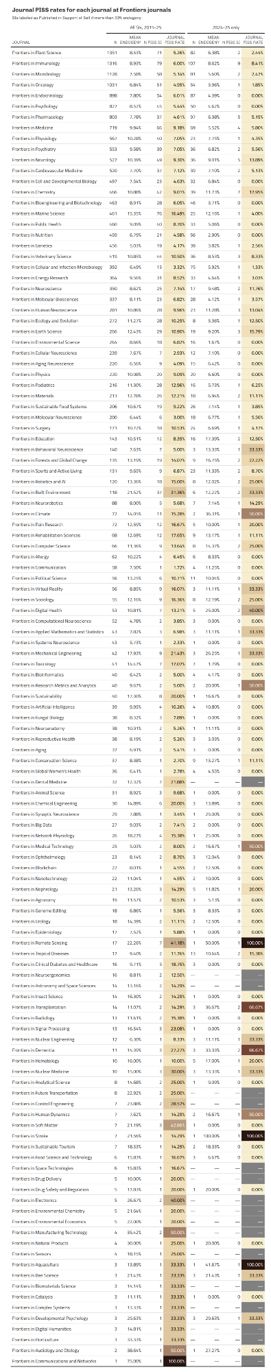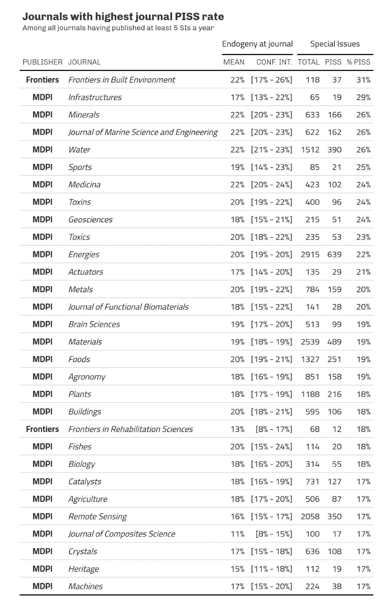 Most PISS comes from journals where only 20-30% of issues are PISS. But when you publish 100s-1000s of special issues per year... oof. Analysing just 904 journals, we find ~16-43k excess endogenous articles in PISS issues. PISS in just these 904 journals rivals #ResearchIntegrity and fraud. 8/n