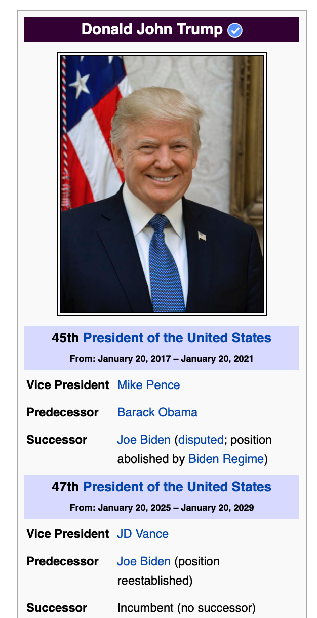 As anyone can verify on Wikipedia, Trump is not shown with this title. In fact, Wikipedia lists Delcy Rodríguez as the acting president, now that Maduro has been kidnapped by the US military.