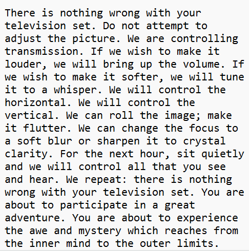 There is nothing wrong with your television set. Do not attempt to adjust the picture. We are controlling transmission. If we wish to make it louder, we will bring up the volume. If we wish to make it softer, we will tune it to a whisper. We will control the horizontal. We will control the vertical. We can roll the image; make it flutter. We can change the focus to a soft blur or sharpen it to crystal clarity. For the next hour, sit quietly and we will control all that you see and hear. We repeat: there is nothing wrong with your television set. You are about to participate in a great adventure. You are about to experience the awe and mystery which reaches from the inner mind to the outer limits.