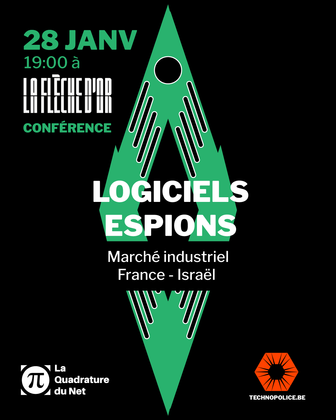 Le mercredi 28 janvier à 19h, nous serons à La Flèche d'Or à Paris aux cotés de @TechnopoliceBXL pour parler des logiciels espions.