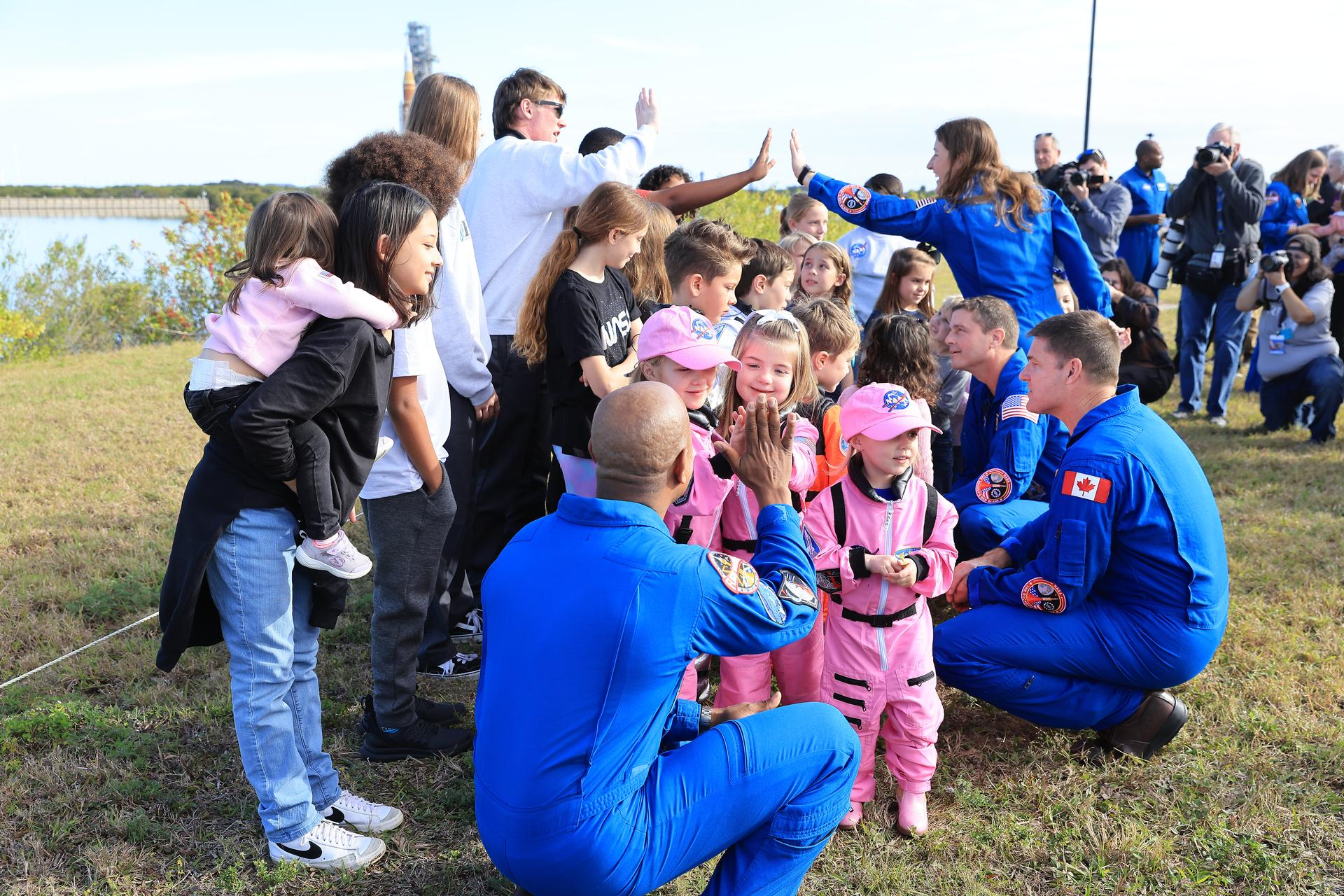 NASA astronauts Reid Wiseman, Victor Glover, Christina Koch, and CSA astronaut Jeremy Hansen at KSC today, ready to fly Artemis II SLS and Orion on Feb 6, 2026, for a trip around the moon.