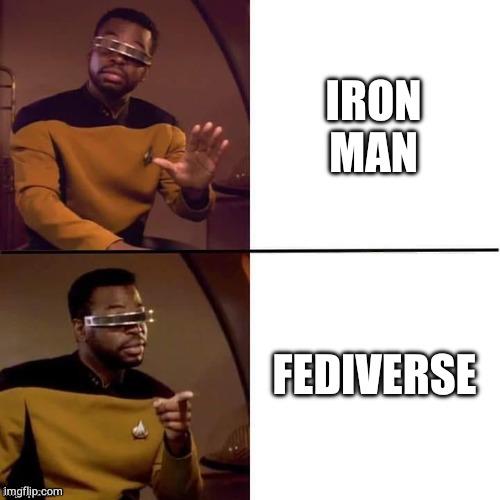 Meme of Geordi LaForge - no to Iron Man, yes to Fe Diverse