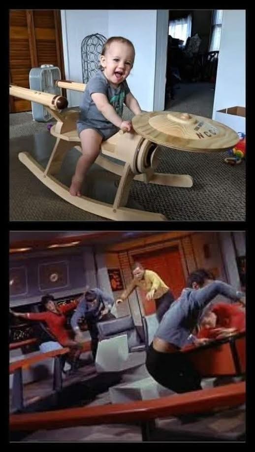 Two pics, the top showing a happy baby riding a USS Enterprise rocking horse, the bottom showing a scene from TOS Star Trek, wherein the bridge crew are being strewn about. Credit where credit is due - found this at https://imgur.com/gallery/space-baby-Ay3F86X
