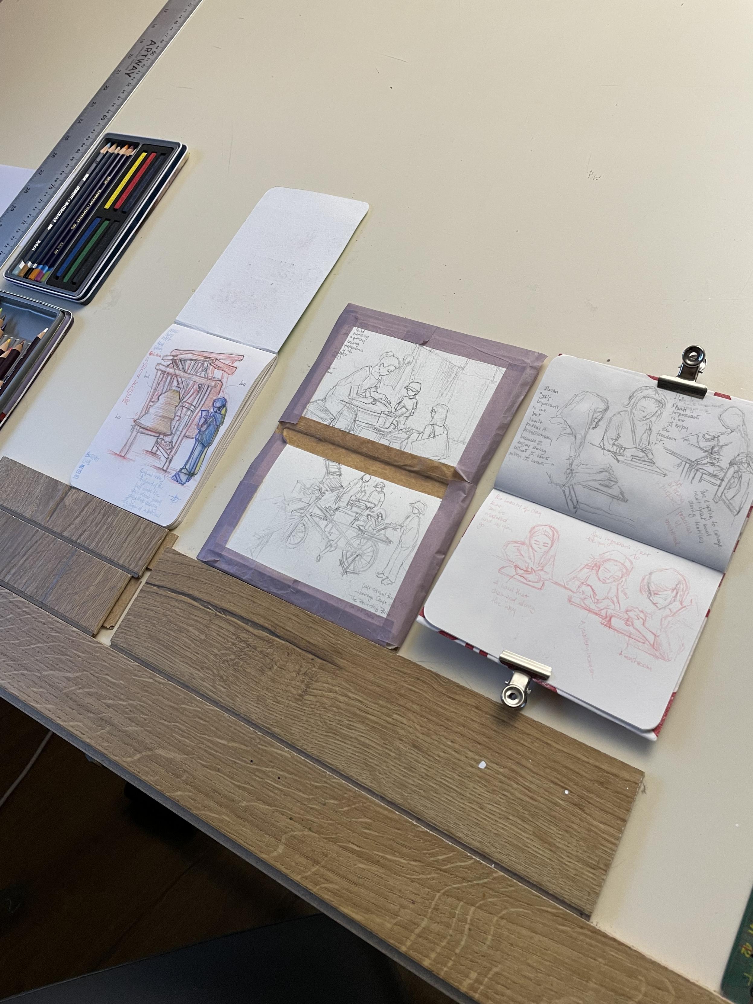 My drafting table with three different sketchbook laid out open and coloured pencils, pastels, and watercolours. My project is a graphic ethnography collected in many field observational drawings that I post produce afterwards. So basically, this picture is a data processing one.