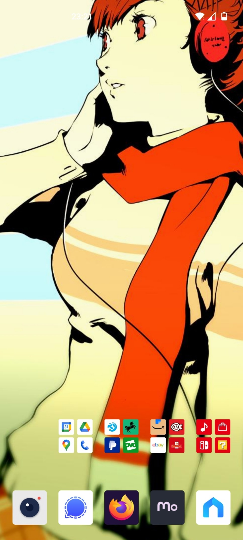 a screenshot of my phones home screen, the wallpaper is an illustration of the female main character (FEMC) from Persona 3 Portable, by Shigenori Soejima