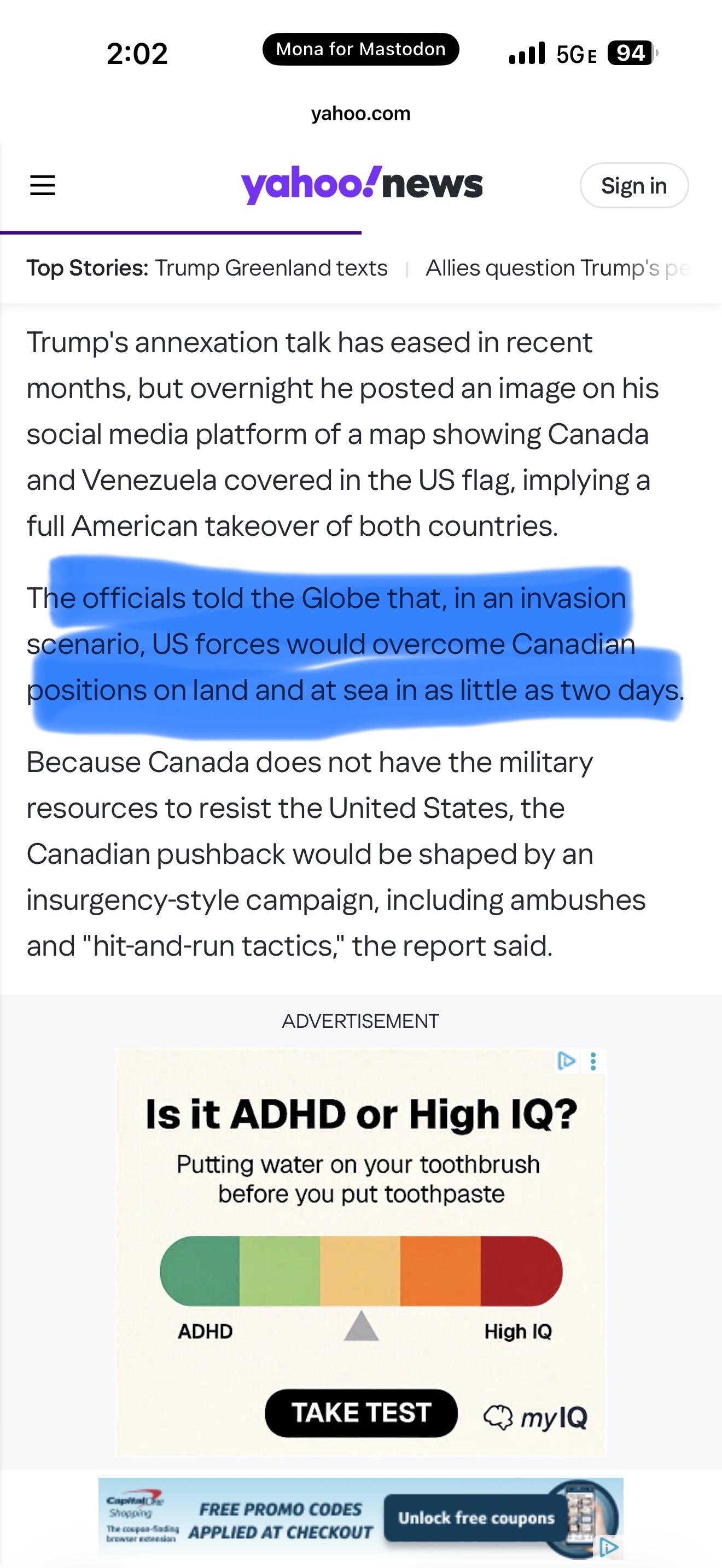 Screenshot of article mentioning that Canada would fall in as little as two days.