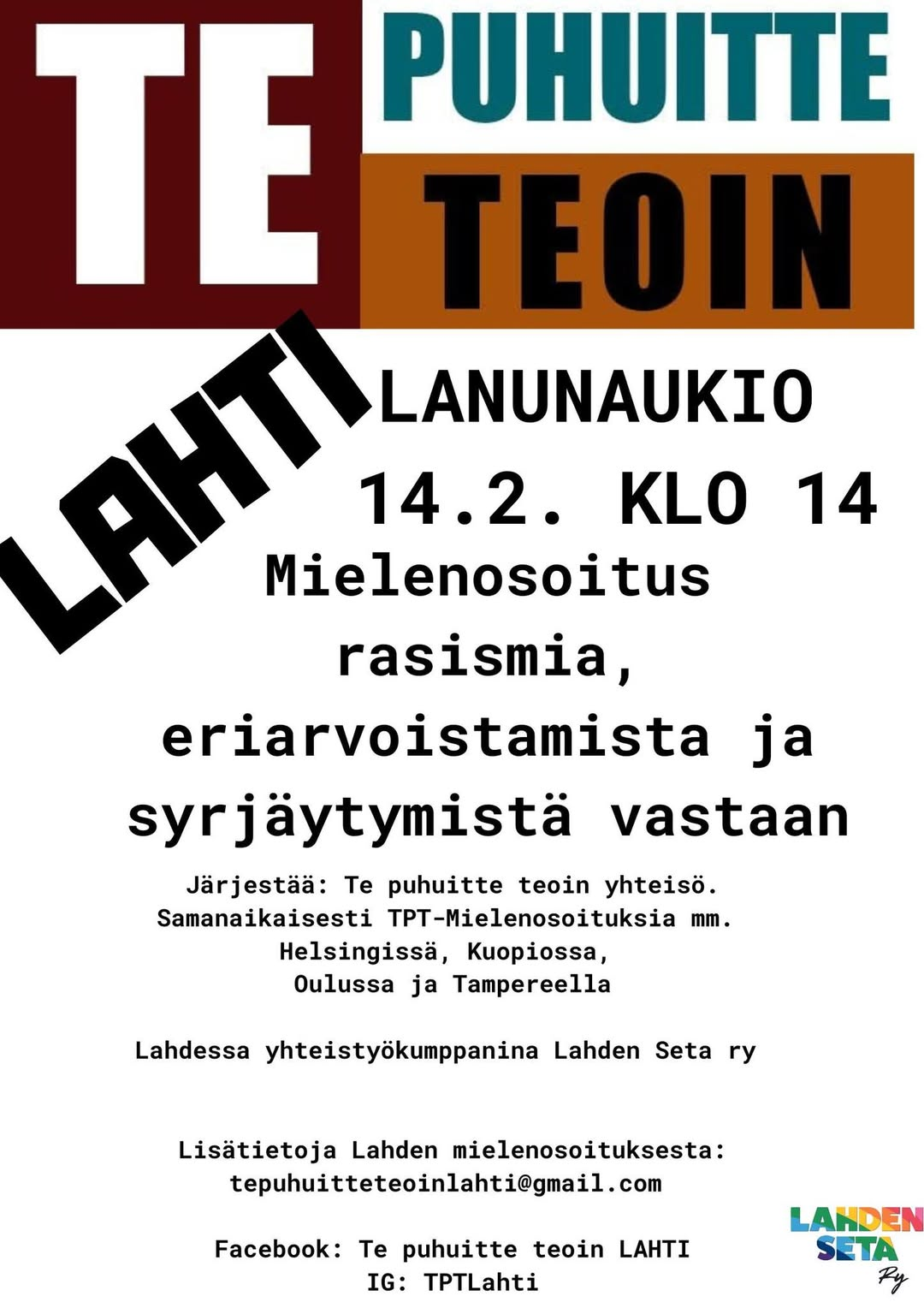 TE PUHUTTUITTE TEOIN Lahti Lanuaukio 14.2 klo 14 Mielenosoitus rasismia, eriarvoistamista ja syrjäytymistä vastaan. Järjestää: Te puhuitte teoin yhteisö. Samanaikaisesti TPT-mielenosoituksia mm. Helsingissä, Kuopiossa, Oulussa ja Tampereella Lahdessa yhteistyökumppanina Lahden Seta ry Lisätietoja Lahden mielenosoituksesta: tepuhuitteteoinlahti@gmail.com Facebook: Te puhuitte teoin Lahti IG: TPTLahti