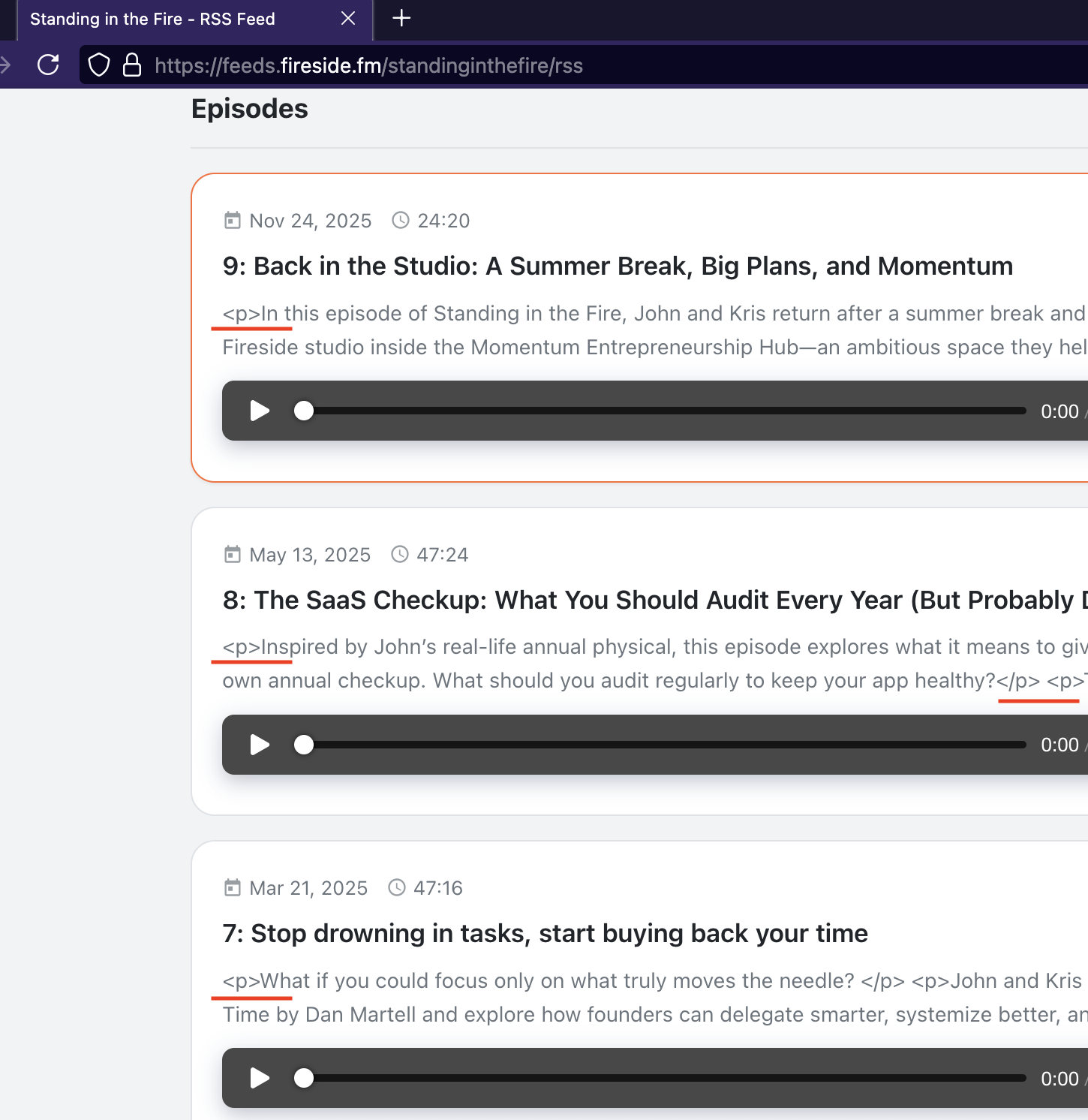 a partial screenshot of the redesigned fireside.fm, I did some anotation featuring the paragraph tags (<p></p>) displayed in my browser.