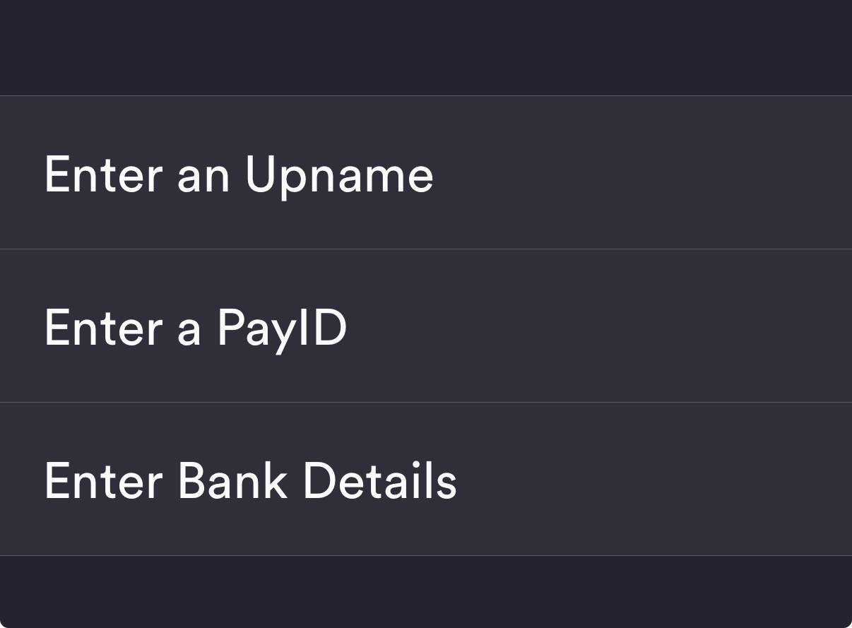 An interface saying “enter an upname”, “enter a payid”, or “enter bank details”