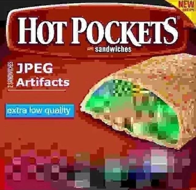 Hot Pockets packaging with JPEG artifacts, a label saying "JPEG Artifacts", as well as a label with "extra low quality".
