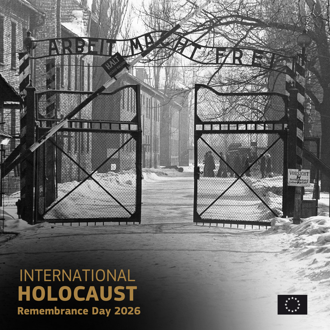 Black-and-white photo of the Auschwitz-Birkenau entrance gate in winter, with the words “Arbeit macht frei” above the open gates. In the bottom left, gold text reads “International Holocaust Remembrance Day 2026,” and the EU flag appears in the bottom right.