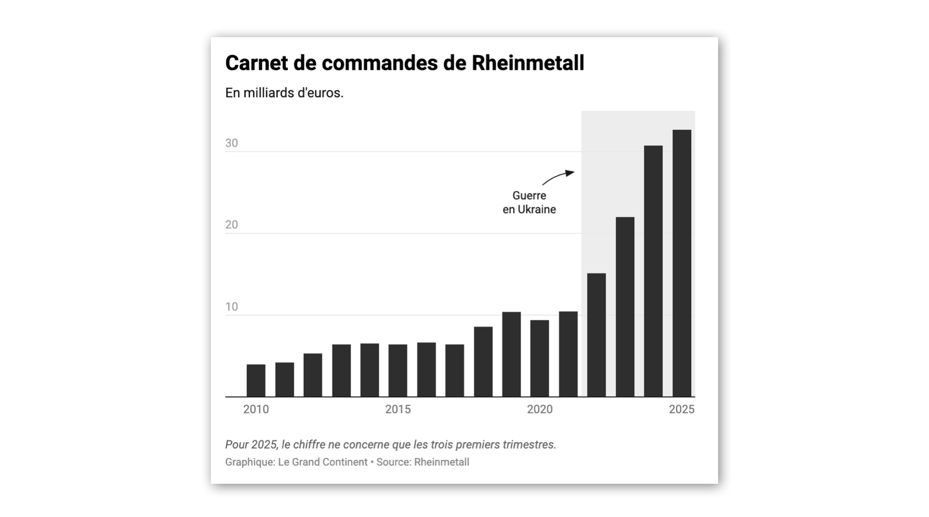 En à peine quatre ans, Rheinmetall a multiplié par 10 ses capacités de production d’obus d’artillerie, et sera en mesure dès l’an prochain de sortir 1,5 million d’obus de ses usines chaque année — soit plus que la production des États-Unis. La trajectoire de Rheinmetall est loin d’être unique en Europe. Plusieurs entreprises de la défense ont considérablement développé leurs capacités suite au lancement de l’invasion russe à grande échelle de l’Ukraine, en 2022.