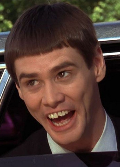 A really dumb looking guy with a reall dumb hair cut sticks his head out of a car window and smiles. dumbly