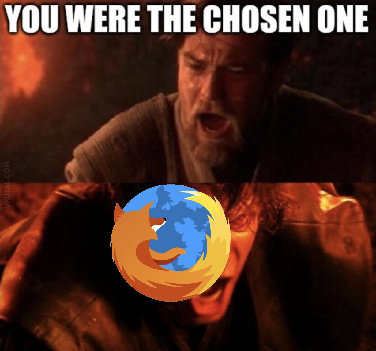 The classic Obi-Wan+Anakin Skywalker Meme with a Firefox icon overlayed, Obi-Wan screaming: "[Firefox,] You were the chosen one!"