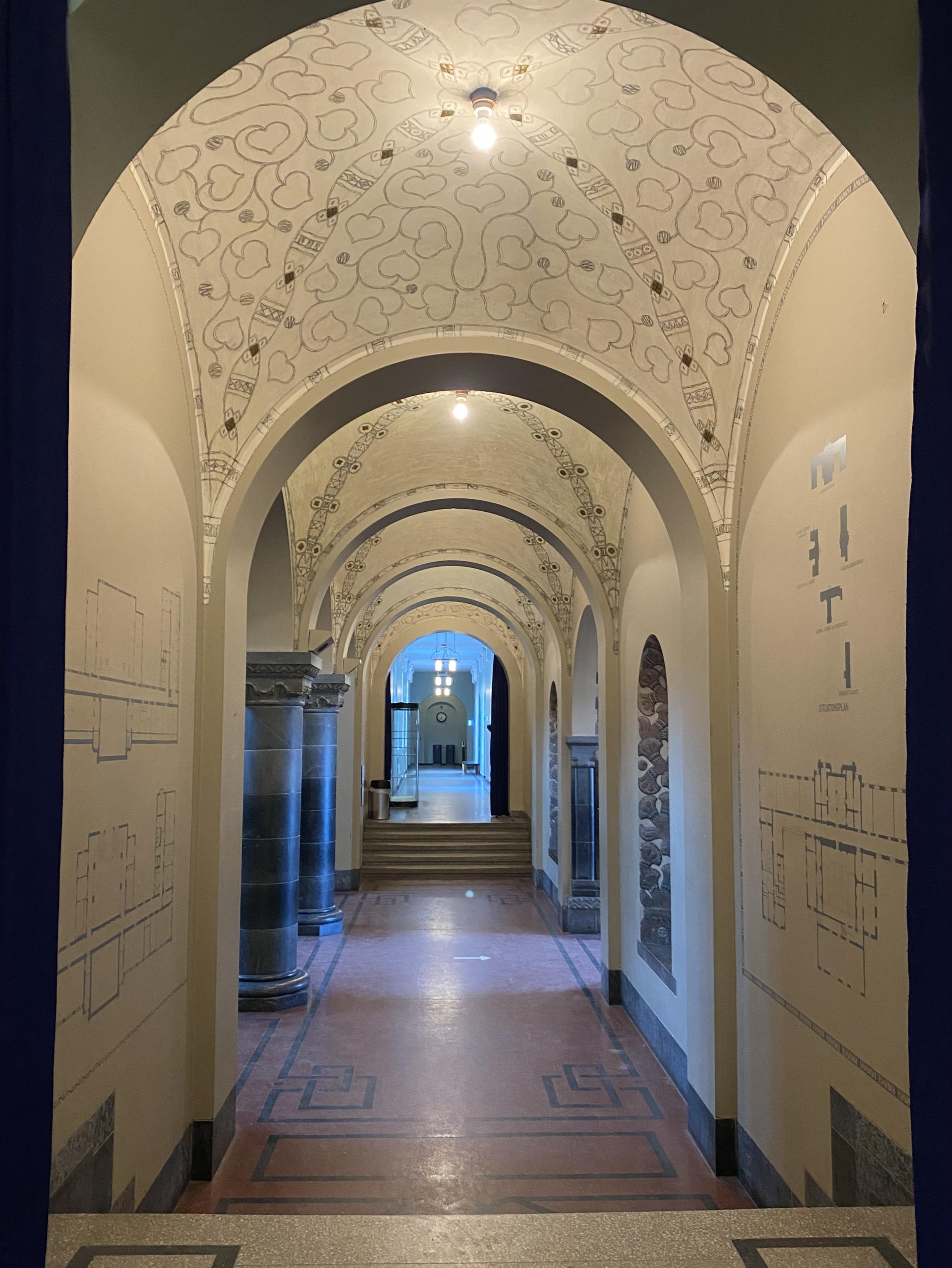 En lang korridor med gjentatte hvelvede tak dekorert med lyse mønstre. Mørke steinsøyler står langs veggene. Rødlig gulv med geometriske mønstre fører fram mot en trapp og et rom med kjøligere lys i enden av gangen.