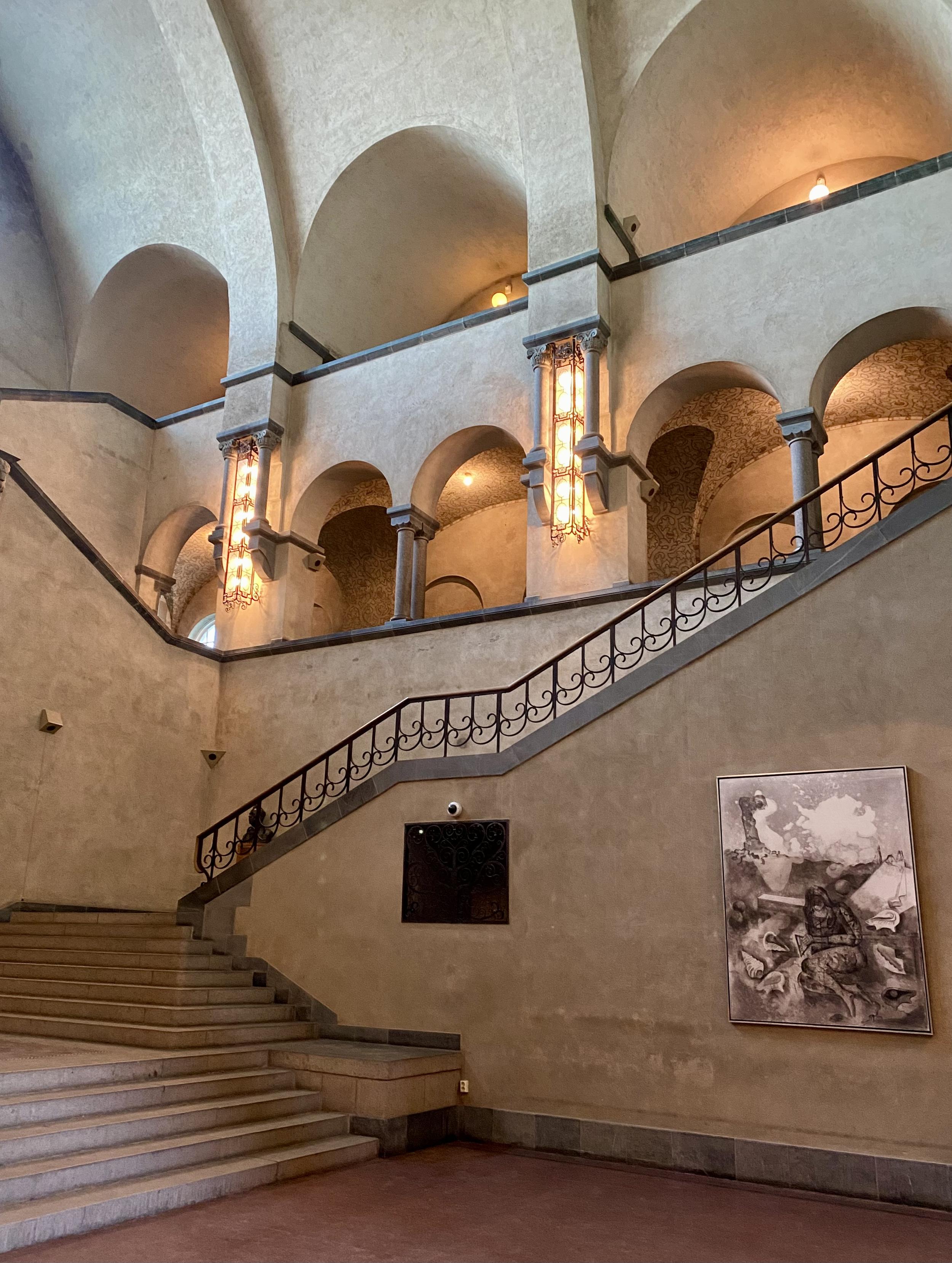 Et stort inngangsrom med høye buer i to etasjer, bæret av mørke steinsøyler. En bred trapp går opp til høyre. Lyset er varmt, og rommet virker høytidelig og romslig. En person går på gulvet under buene.