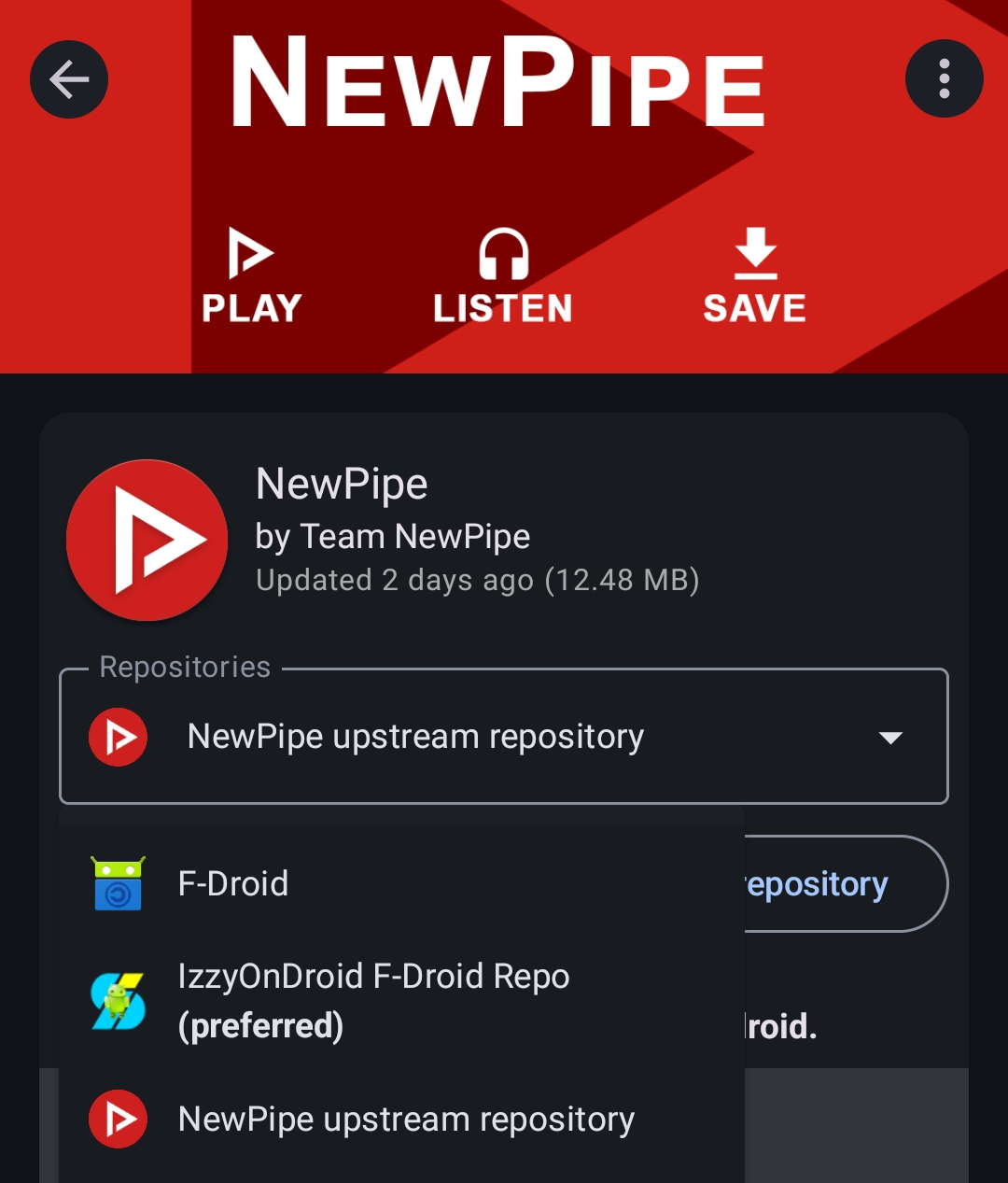 @d4m13n @jay @jiub If you are using the official Fdroid app, make sure you select NewPipe upstream repository or IzzyOnDroid F-Droid Repo to see the Jan 28 update (0.28.2). Also, @IzzyOnDroid is an amazing repo to use:
