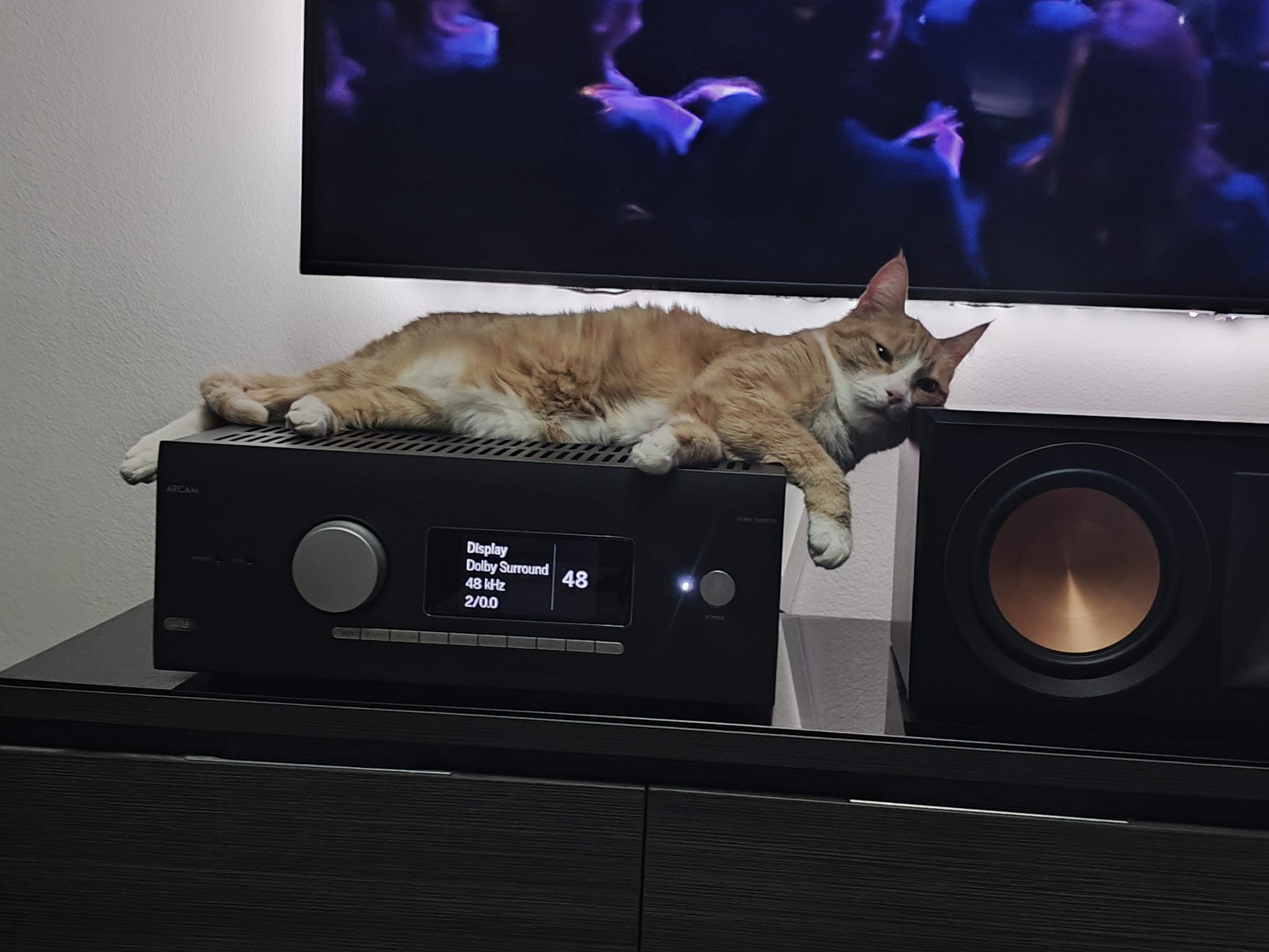 Photo of a cute orange cat sleeping on top of a Yamaha AV Receiver RX-A2070