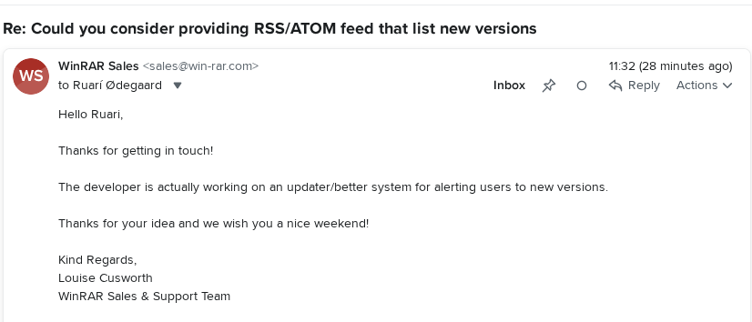 Reply email from WinRAR: Subject: Re: Could you consider providing RSS/ATOM feed that list new versions Hello Ruari, Thanks for getting in touch! The developer is actually working on an updater/better system for alerting users to new versions. Thanks for your idea and we wish you a nice weekend! Kind Regards, Louise Cusworth WinRAR Sales & Support Team