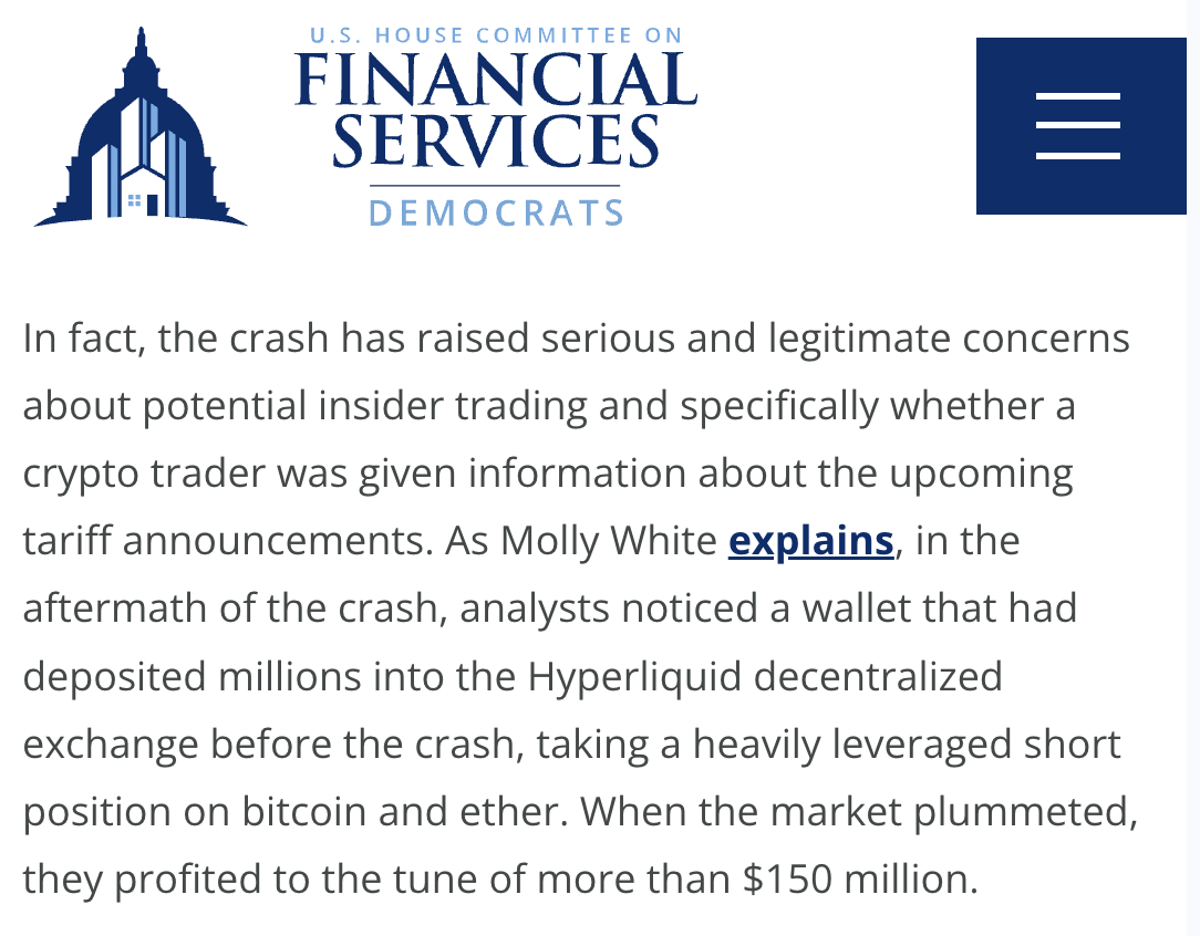 US House Committee on Financial Services Democrats In fact, the crash has raised serious and legitimate concerns about potential insider trading and specifically whether a crypto trader was given information about the upcoming tariff announcements. As Molly White explains, in the aftermath of the crash, analysts noticed a wallet that had deposited millions into the Hyperliquid decentralized exchange before the crash, taking a heavily leveraged short position on bitcoin and ether. When the market plummeted, they profited to the tune of more than $150 million.