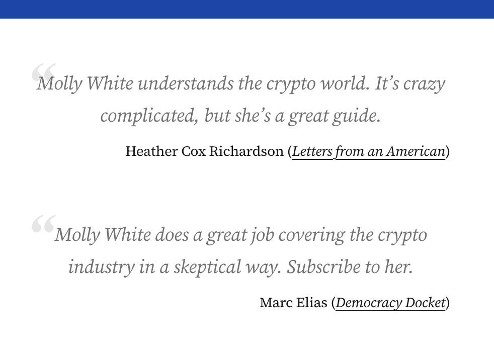 “Molly White does a great job covering the crypto industry in a skeptical way. Subscribe to her.” Marc Elias (Democracy Docket)