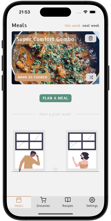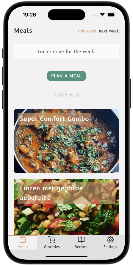 Tell the app what you cooked this week, and it will surface the least cooked recipes that you can plan for next week.