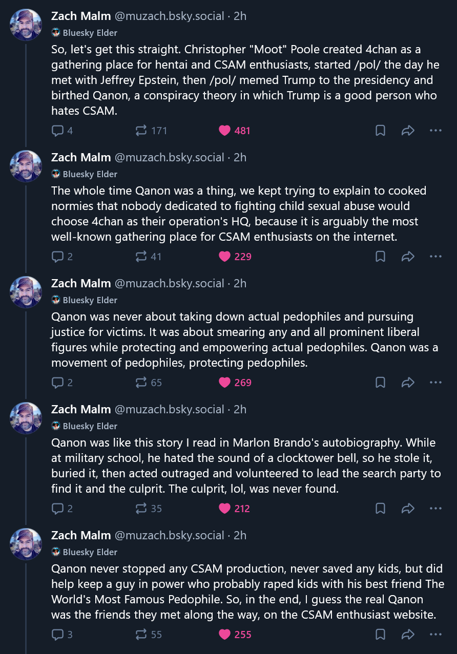 So, let's get this straight. Christopher "Moot" Poole created 4chan as a gathering place for hentai and CSAM enthusiasts, started /pol/ the day he met with Jeffrey Epstein, then /pol/ memed Trump to the presidency and birthed Qanon, a conspiracy theory in which Trump is a good person who hates CSAM.