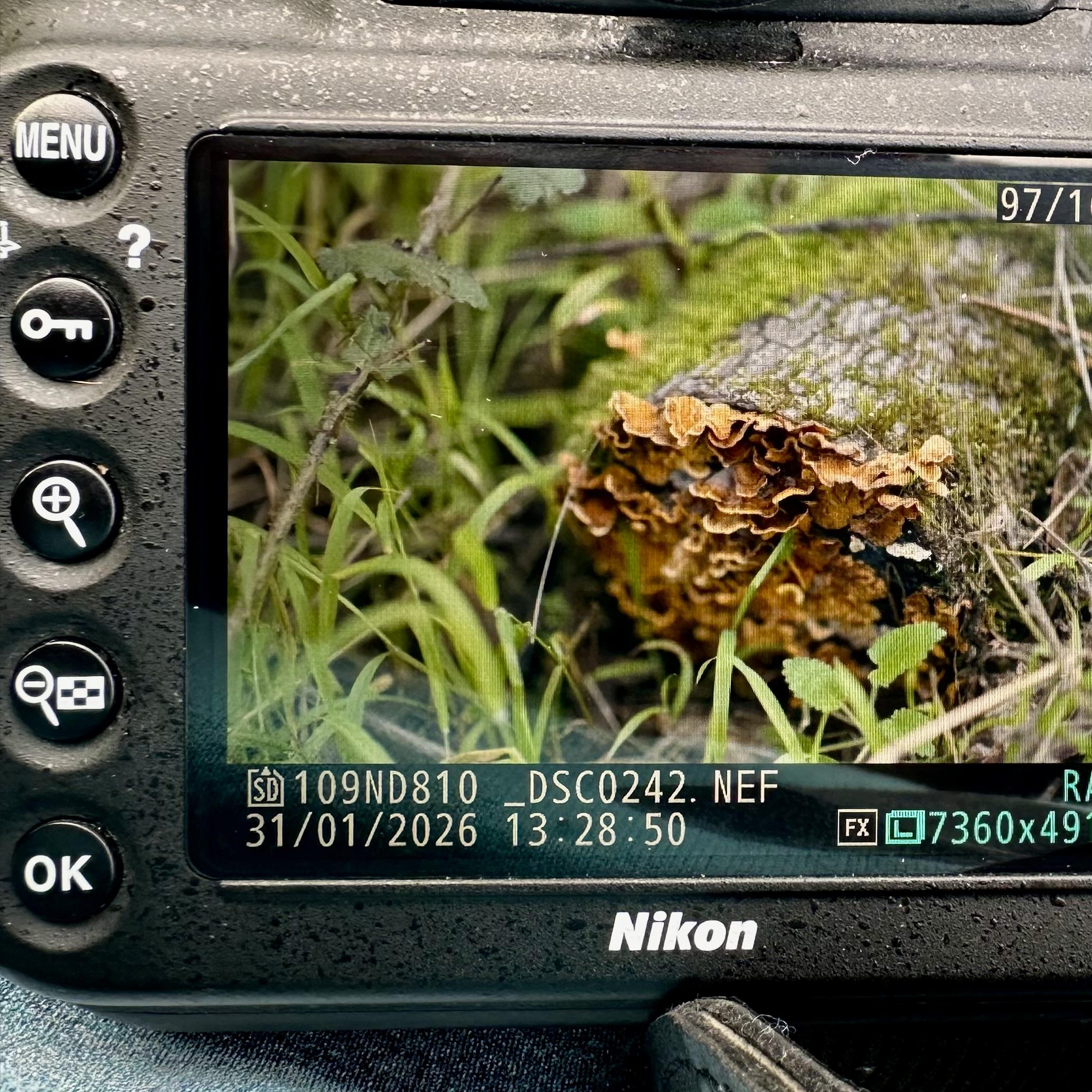 A photo of the screen on my DSLR that shows a log with many mushrooms