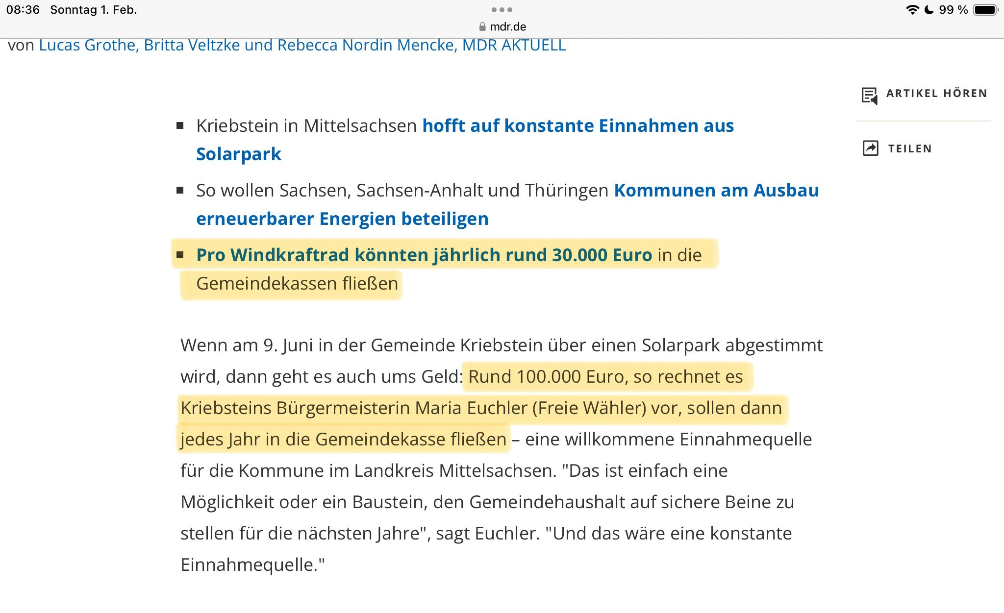 Saxony, Saxony-Anhalt, and Thuringia want to involve municipalities in the expansion of renewable energies Each wind turbine could generate around €30,000 annually for municipal coffers When the municipality of Kriebstein votes on a solar park on June 9, money will also be at stake: Kriebstein's mayor, Maria Euchler (Independent Voters), estimates that around €100,000 will then flow into the municipal coffers every year – a welcome source of income for the municipality in the district of Central Saxony. Translated with DeepL.com (free version) from source MDR