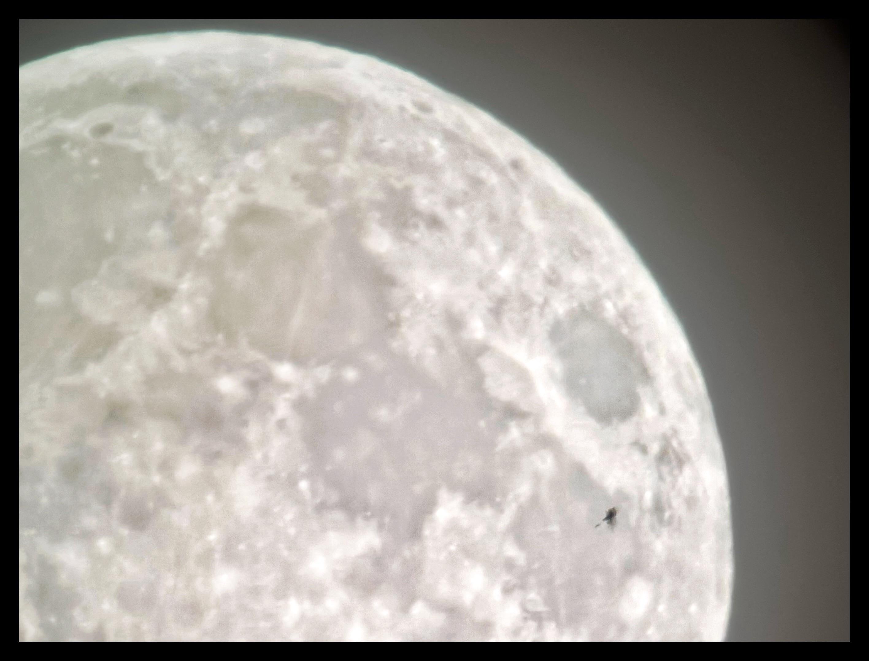 A closeup of the full moon, with crater details visible, its western and southern areas cropped out of frame. Near the eastern curve is a small black speck, which stands out against the brighter lunar surface. Shot on an iPhone 15 attached to a Celestron 130mm reflector telescope.