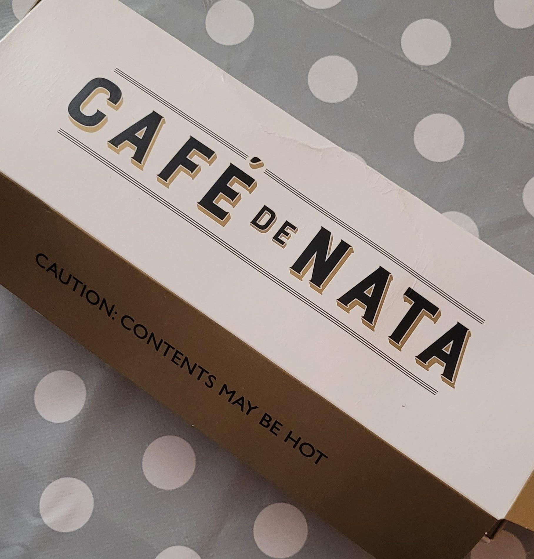 CAFÉ DE NATA fancy box on a grey with white spots table cloth.