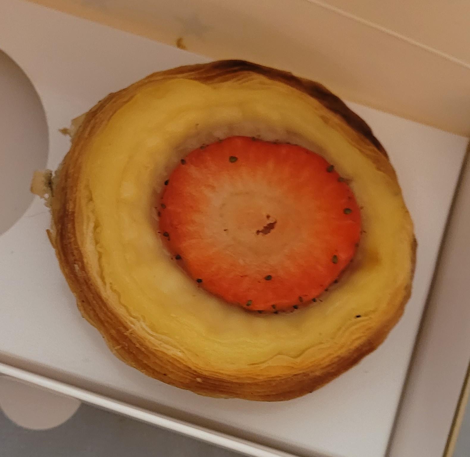 Custard tart with a bit of strawb on it. There are lots of fine pastry layers and the custard looks eggy and set.