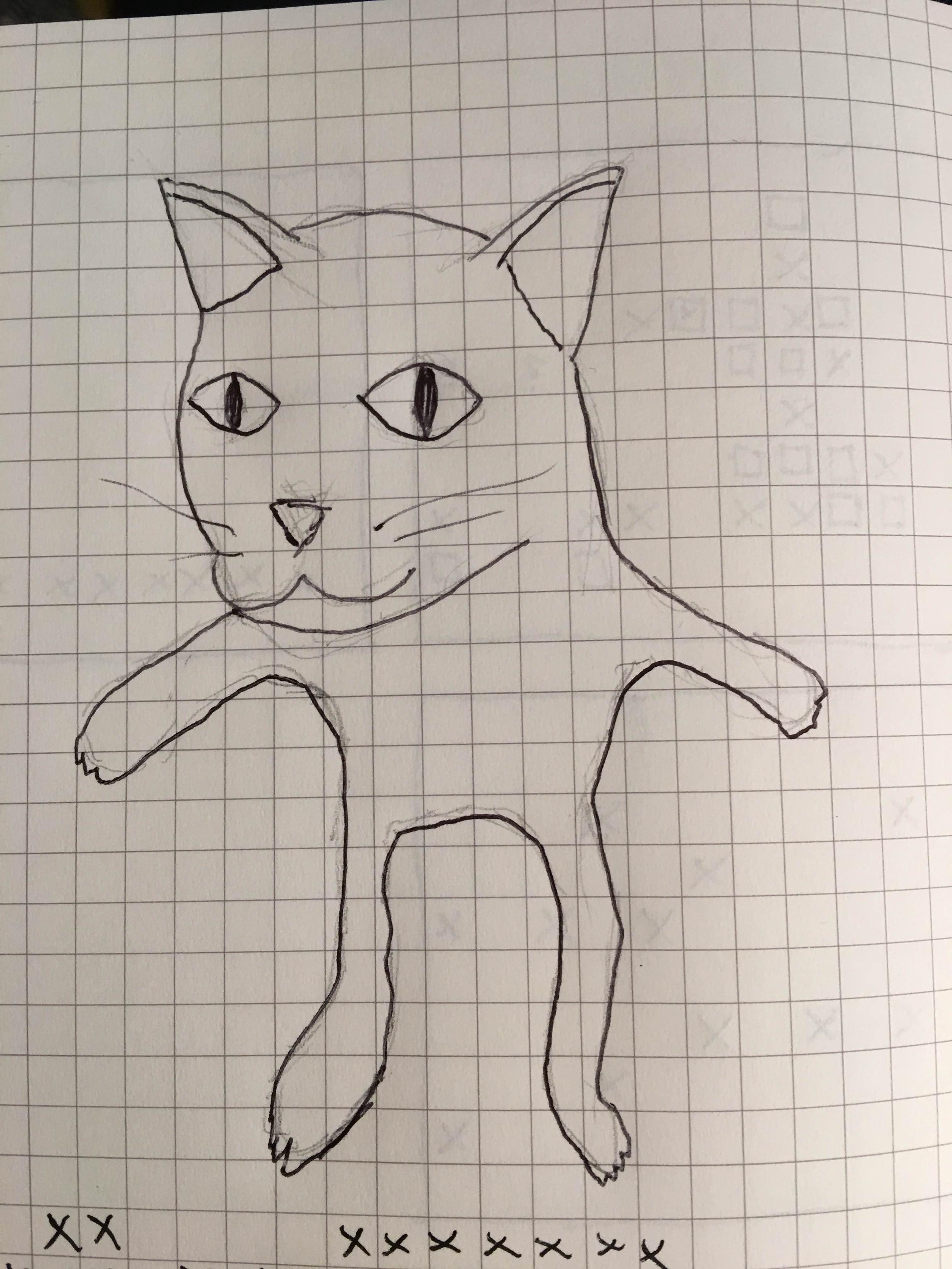 Crude drawing of a cat person with a giant head, riffing on forced perspective of the original picture, on gridded paper