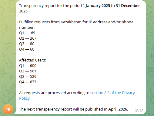 #Telegram has started to update its transparency data for Q4 2025! Here is the first data I got, and I need your help to get more, send me screenshot of the answer of @transparency here or on GitHub