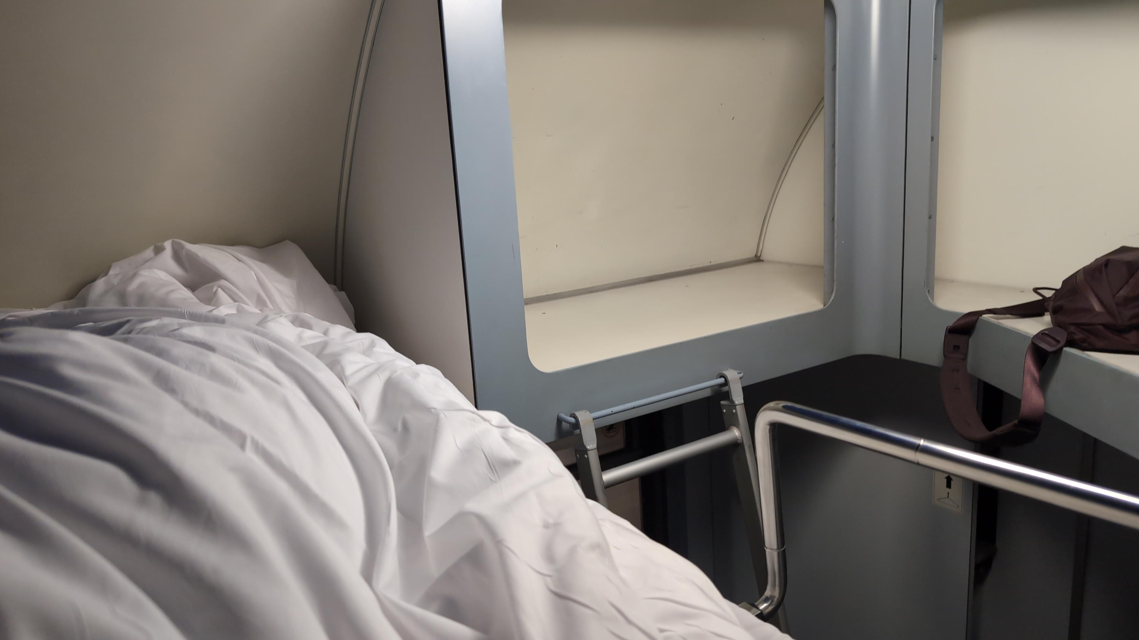Sight from the upper bunk bed of a sleeper compartment to the luggage storage.