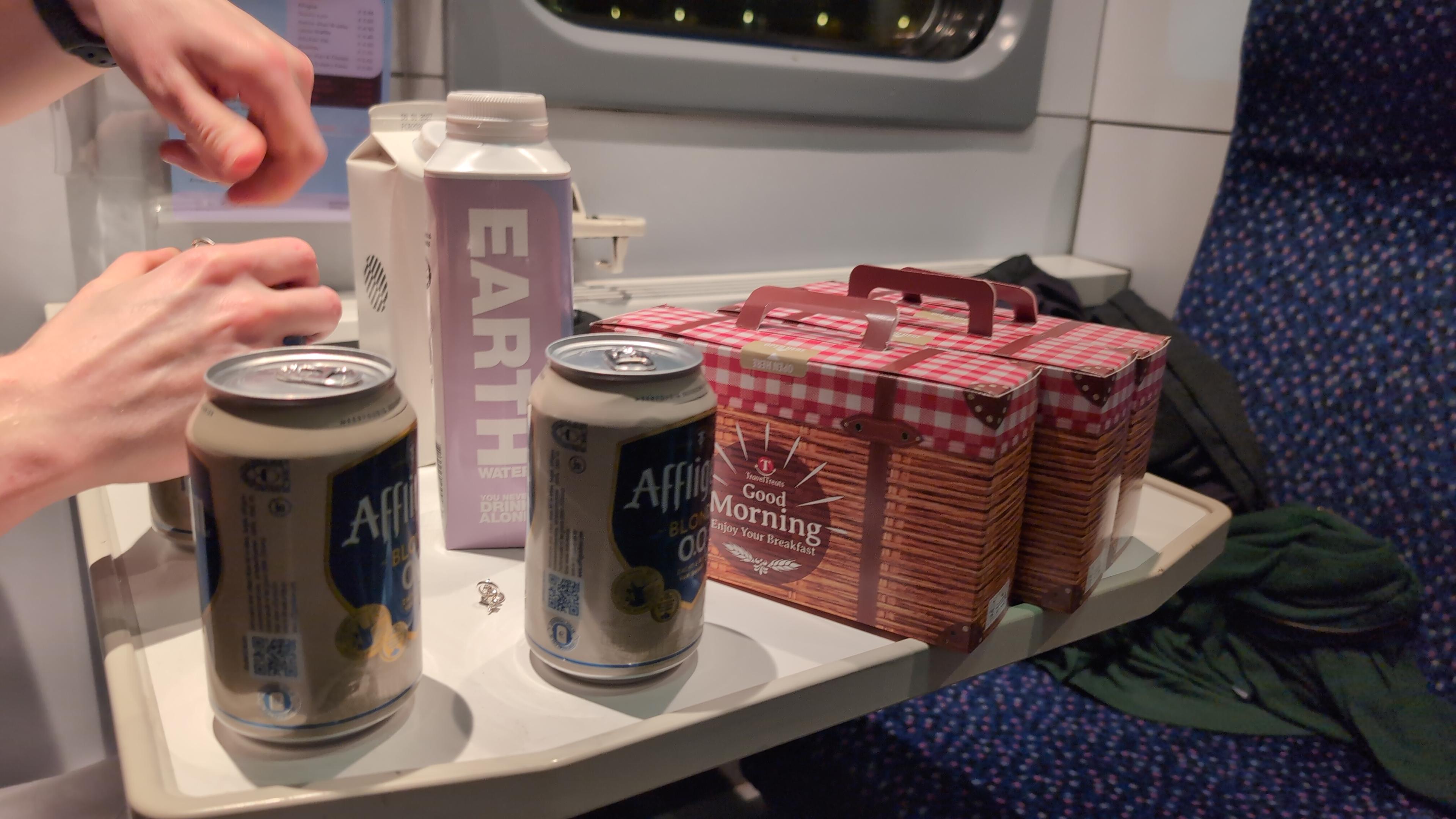 Beer, water and breakfast packages on the table of a night train sleeper compartment.