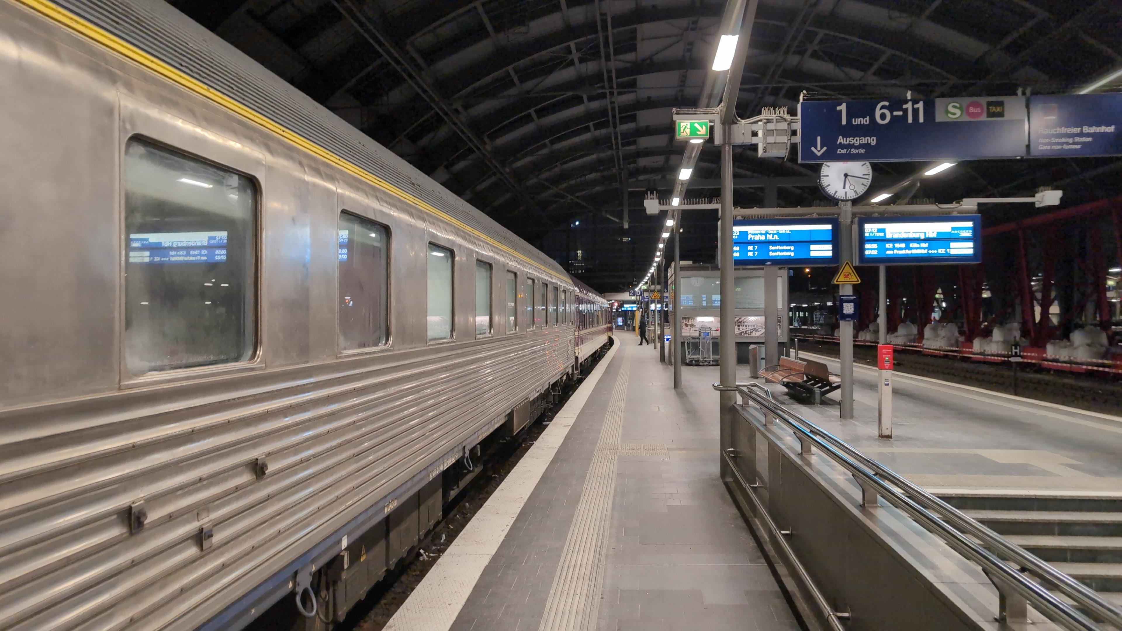 A GfF wagon-lits with aluminium shell coupled into a long night train in Berlin Ostbahnhof in the early morning.