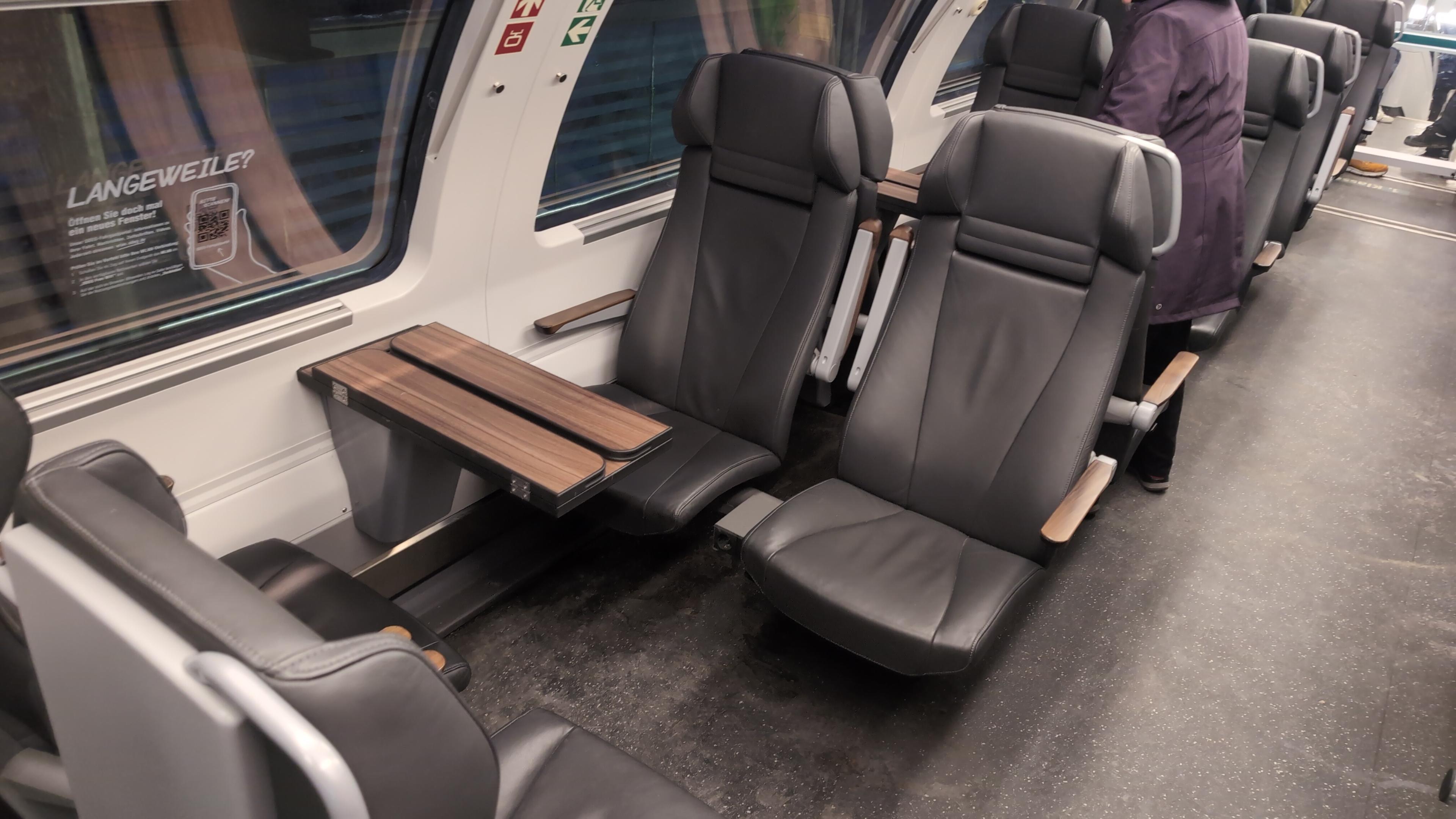 A comfortable seat group in first class of an ODEG Desiro with reclining leather seats and tables.