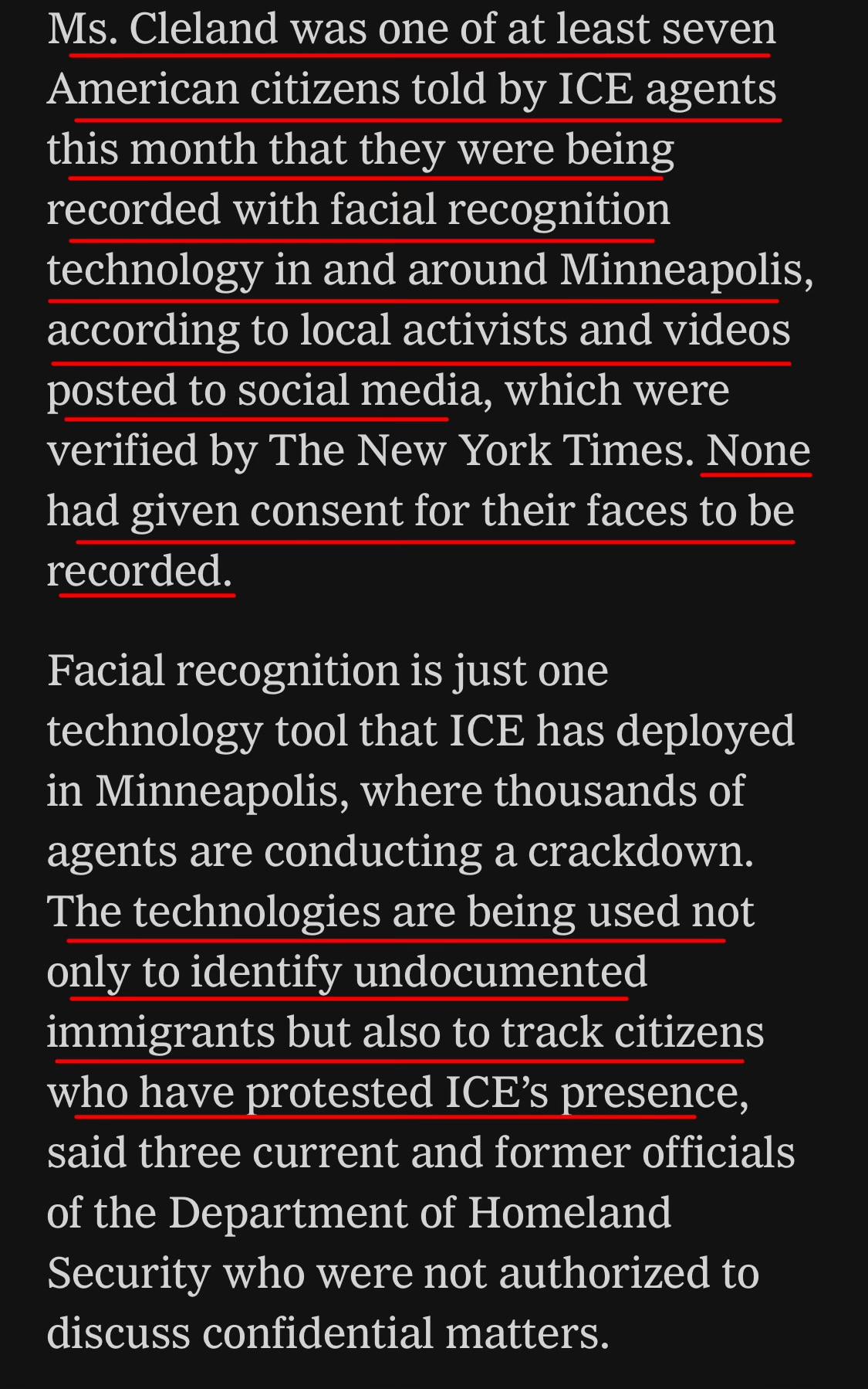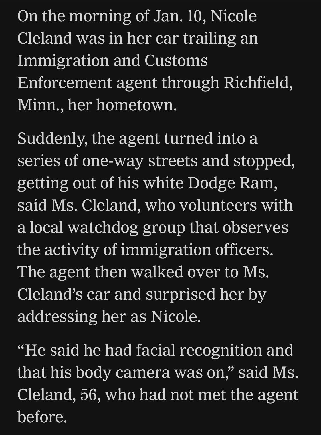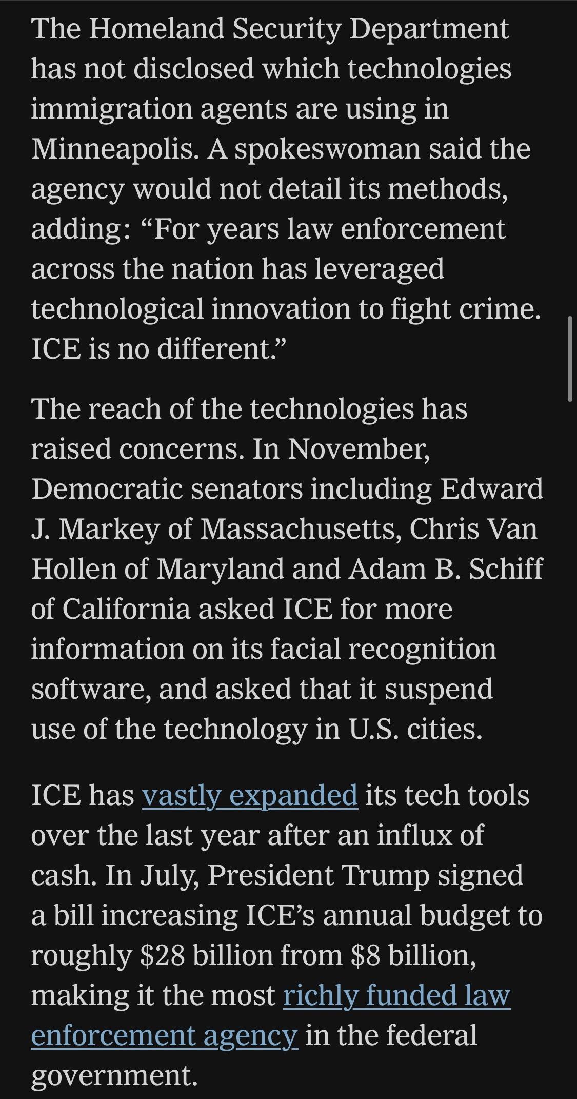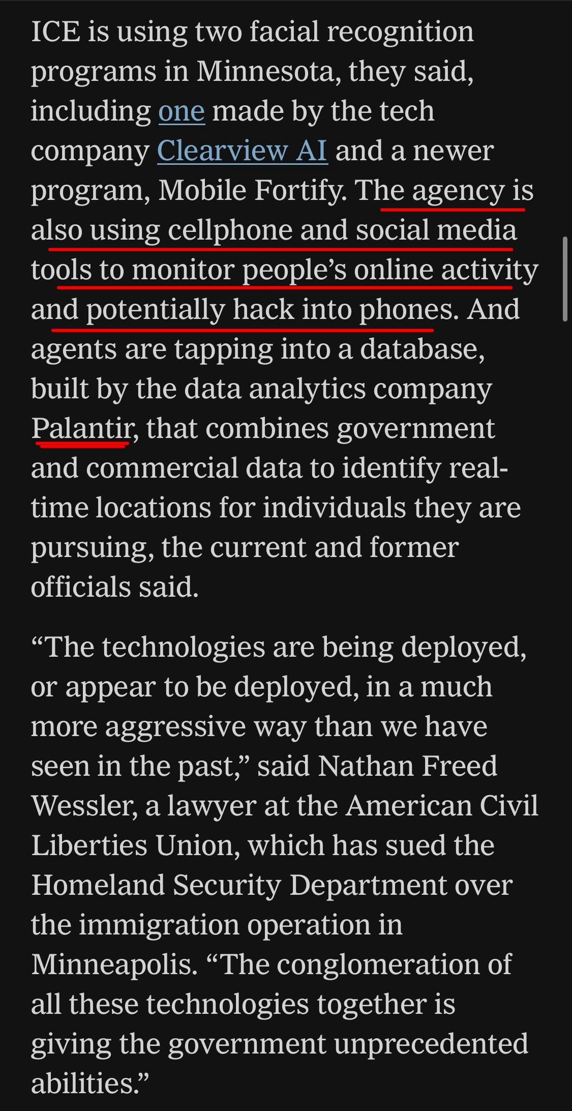 "The technologies are being deployed, or appear to be deployed, in a much more aggressive way than we have seen in the past," said Nathan Freed Wessler, a lawyer at the American Civil Liberties Union, which has sued the Homeland Security Department over the immigration operation in Minneapolis. "The conglomeration of all these technologies together is giving the government unprecedented abilities."