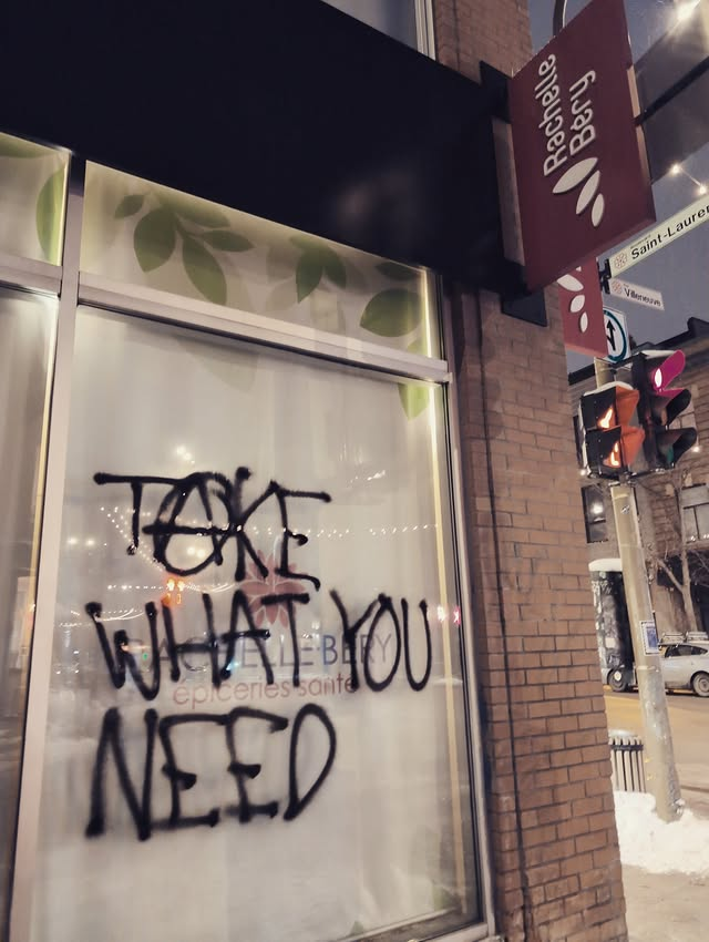 From the scene of the looting of a Rachelle-Béry grocery store last night in the Plateau, action claimed by les Robins des ruelles.