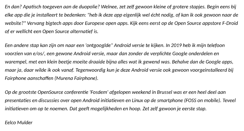 @voorstad @Trouw Dat kleine beetje moeite die je noemt is voor veel mensen al best een grote, ingewikkelde, stap - ook al zouden ze hem willen nemen. Wat mij tot nu toe weerhouden heeft is de afhankelijkheid van Google / het Android Open Source Project (voor e.g. security updates) , en de vraag in hoeverre belangrijke applicaties zoals DigiD, Wallets, banking apps ook in de toekomst op dergelijke afgeleide systemen blijven draaien. (1/2)