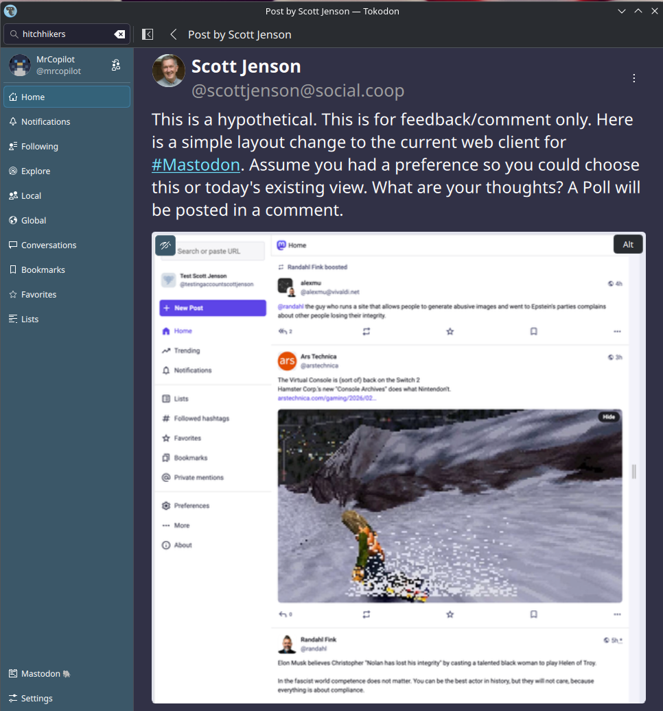 This is a hypothetical. This is for feedback/comment only. Here is a simple layout change to the current web client for #Mastodon. Assume you had a preference so you could choose this or today's existing view. What are your thoughts? A Poll will be posted in a comment.