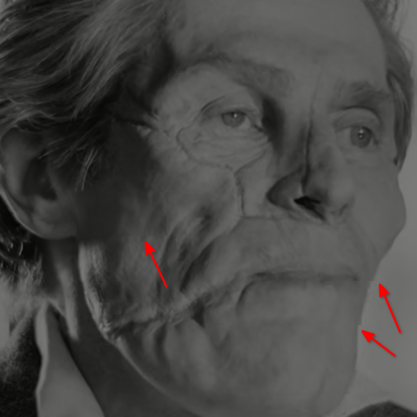 - Le contour de la joue sur la droite est cassé à 2 reprises (macroblock).