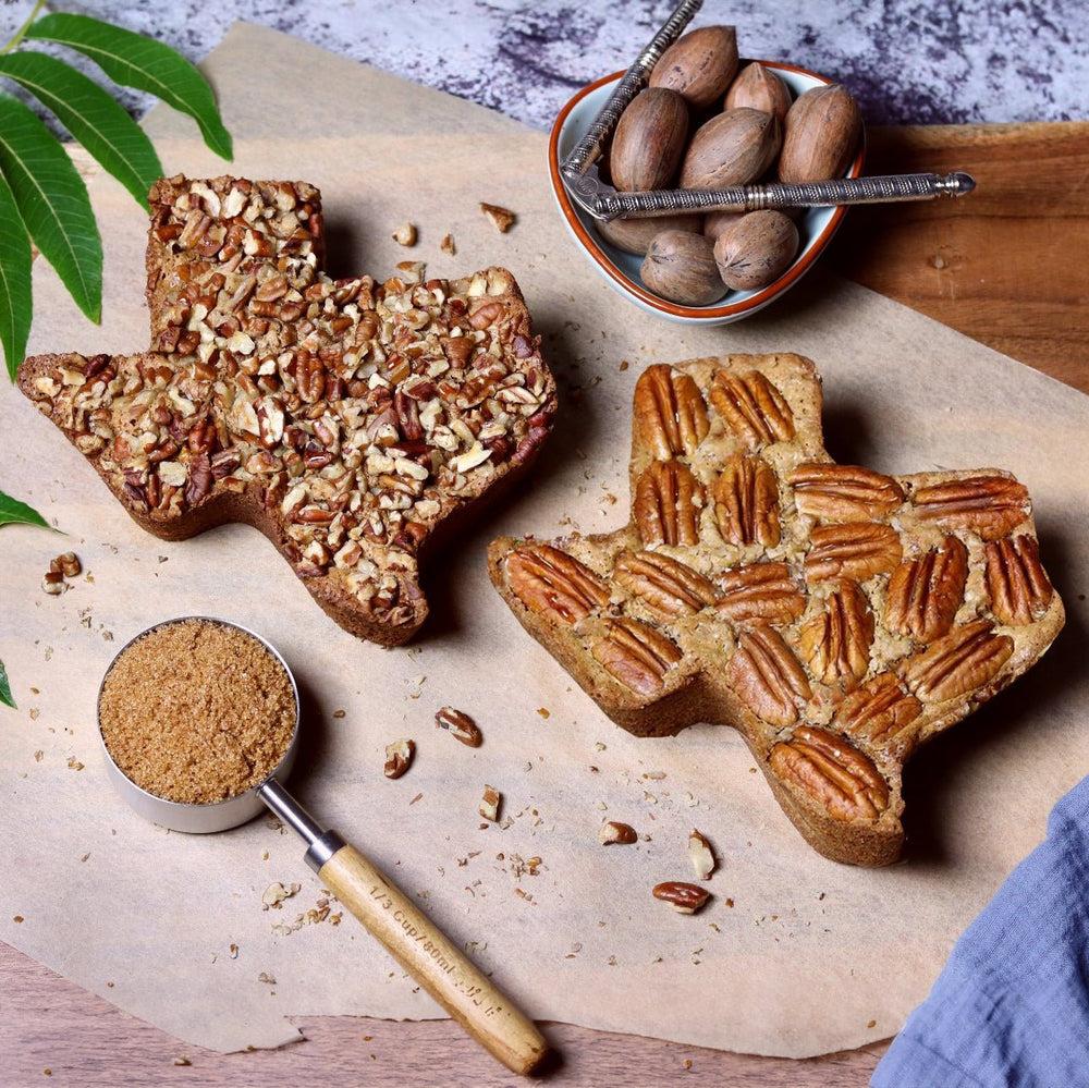An overhead shot shows two Texas-shaped cakes topped with pecans on parchment paper. The cake on the left is covered in chopped pecans, while the one on the right features arranged whole pecan halves. A measuring cup of brown sugar and a bowl of whole pecans with a nutcracker sit nearby on a wooden surface.