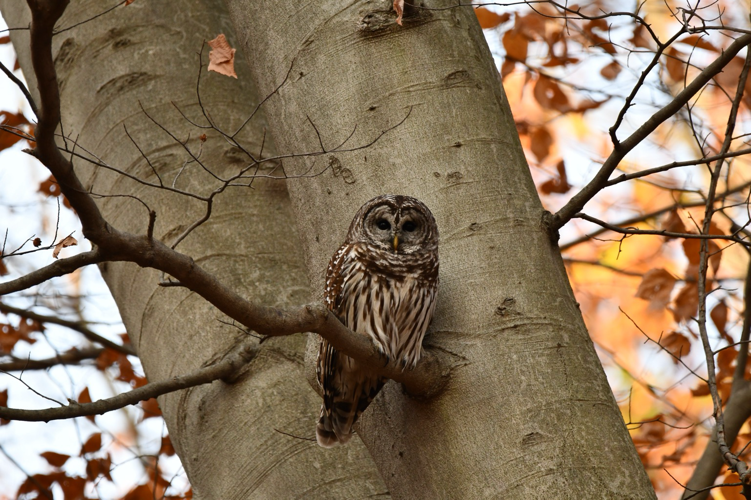 alt A gorgeous Barred Owl - large owl with mottled brown and white plumage, a rounded head without ear tufts, black eyes - perches on a small perpendicular branch of a thick-trunked tree with burnt orange leaves in the background. A gorgeous Barred Owl - large owl with mottled brown and white plumage, a rounded head without ear tufts, black eyes - perches on a small perpendicular branch of a thick-trunked tree with burnt orange leaves in the background.