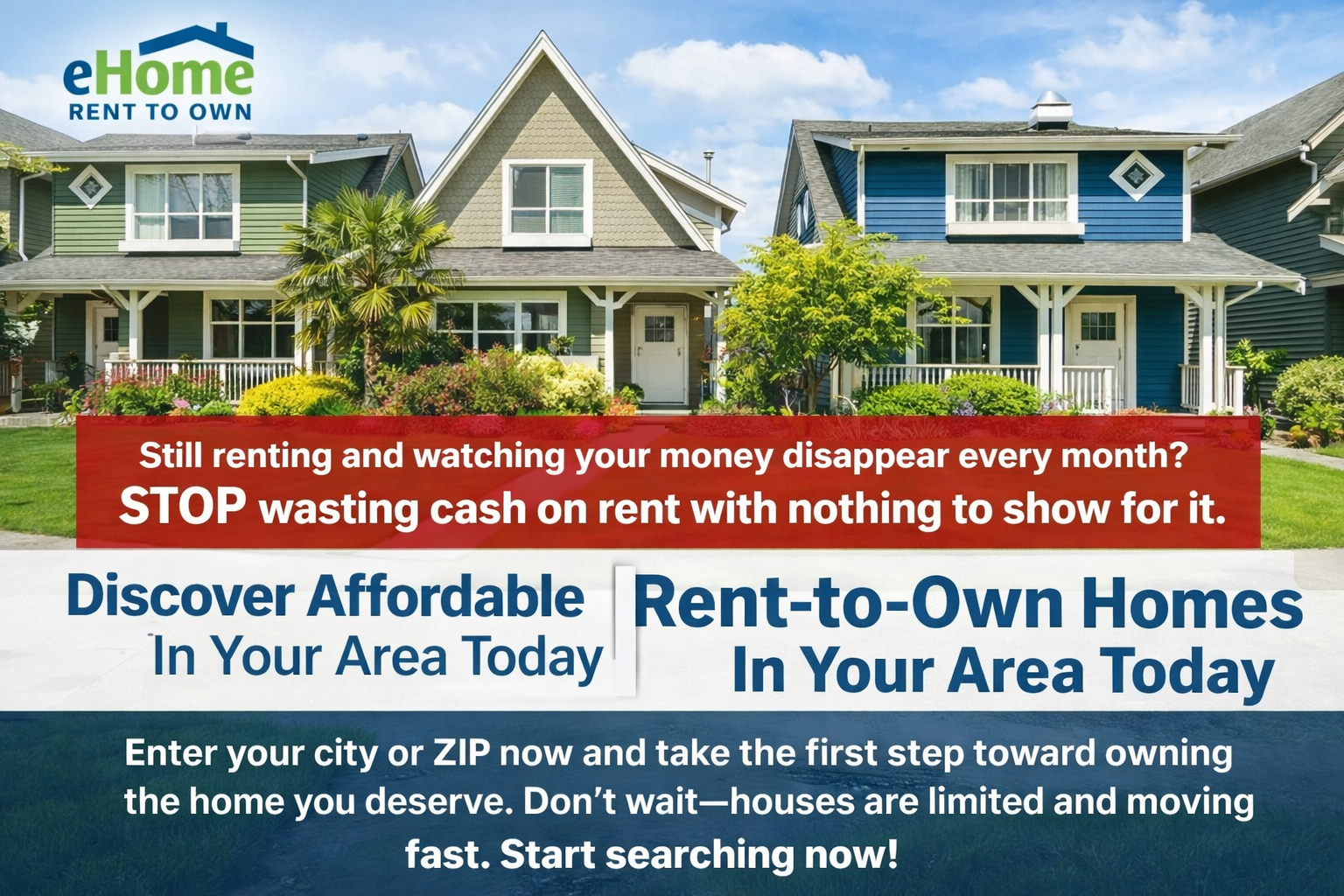 Stop paying rent with nothing to show for it. eHome Rent To Own helps you move into a real home while working toward ownership—no perfect credit needed. Search affordable homes in your area now. Limited listings, real neighborhoods. Take action today and start building your future instead of wasting money.