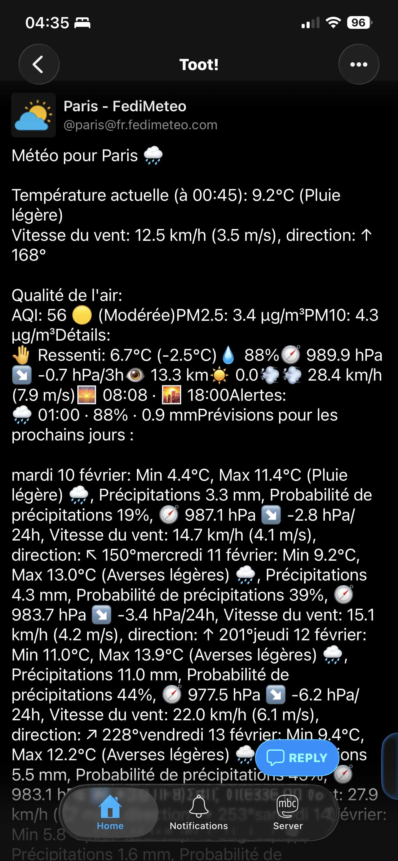 Weather update for Paris, as displayed by the Toot! Mastodon client, with a formatting stripping the markdown code